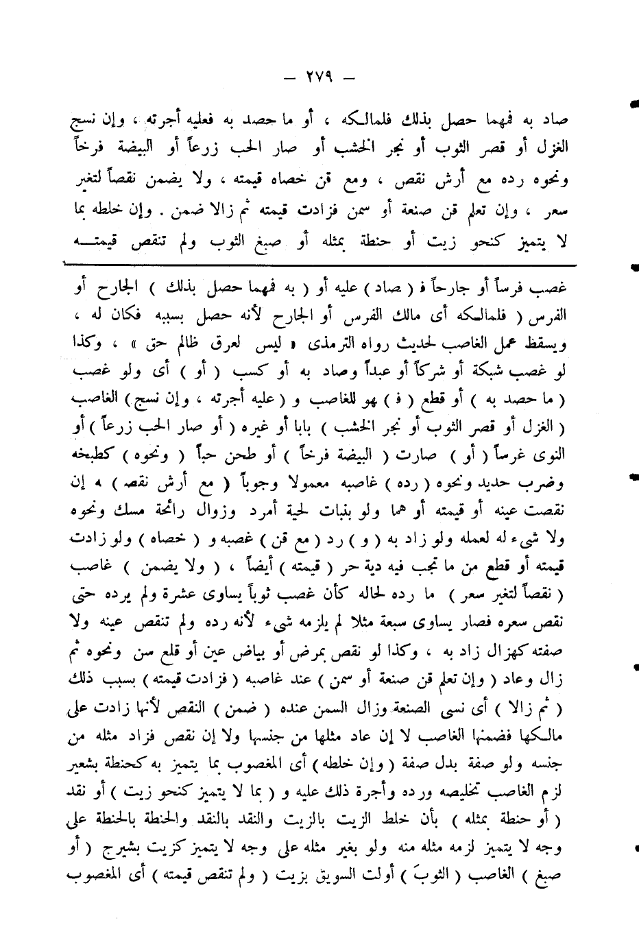 غصب فرسا أو جارحا فـ (صاد) عليه أو (به فمهما حصل بذلك) الجارح أو الفرس (فلمالكه) أي مالك الفرس أو الجارح لأنه حصل بسببه فكان له، ويسقط عمل الغاصب لحديث رواه الترمذي «ليس لعرق ظالم حق»، وكذا لو غصب شبكة أو شركا أو عبدا وصاد به أو كسب (أو) أي ولو غصب (ما حصد به) أو قطع (فـ) ـهو للغاصب و (عليه أجرته، وإن نسج) الغاصب (الغزل أو قصر الثوب أو نجر الخشب) بابا أو غيره (أو صار الحب زرعا) أو النوى غرسا (أو) صارت (البيضة فرخا) أو طحن حبا (ونحوه) كطبخه وضرب حديد ونحوه (رده) غاصبه معمولا وجوبا (مع أرض نقصـ) ـه إن نقصت عينه أو قيمته أو هما ولو بنبات لحية أمرد وزوال رائحة مسك ونحوه ولا شيء له لعمله ولو زاد به (و) رد (مع قن) غصبه و (خصاه) ولو زادت قيمته أو قطع من ما تجب فيه دية حر (قيمته) أيضا، (ولا يضمن) غاصب (نقصا لتغير سعر) ما رده لحاله كأن غصب ثوبا يساوي عشرة ولم يرده حتى نقص سعره فصار يساوي سبعة مثلا لم يلزمه شيء لأنه رده ولم تنقص عينه ولا صفته كهزال زاد به، وكذا لو نقص بمرض أو بياض عين أو قلع سن ونحوه ثم زال وعاد (وإن تعلم قن صنعة أو سمن) عند غاصبه (فزادت قيمته) بسبب ذلك (ثم زالا) أي نسى الصنعة وزال السمن عنده (ضمن) النقص لأنها زادت على مالكها فضمنها الغاصب لا إن عاد مثلها من جنسها ولا إن نقص فزاد مثله من جنسه ولو صفة بدل صفة (وإن خلطه) أي المغصوب بما يتميز به كحنطة بشعير لزم الغاصب تخليصه ورده وأجرة ذلك عليه و (بما لا يتميز كنحو زيت) أو نقد (أو حنطة بمثله) بأن خلط الزيت بالزيت والنقد بالنقد والحنطة بالحنطة على وجه لا يتميز لزمه مثله منه ولو بغير مثله على وجه لا يتميز كزيت بشيرج (أو صبغ) الغاصب (الثوب) أولت السوبق بزيت (ولم تنقص قيمته) أي المغصوب