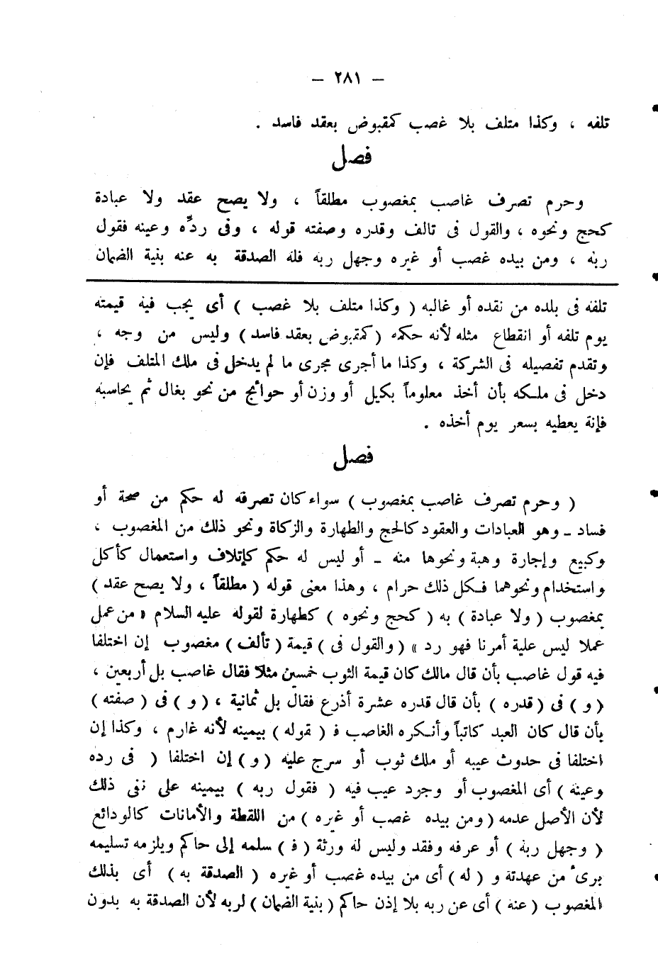 فصل وحرم تصرف غاصب بمغصوب مطلقا، ولا يصح عقد ولا عبادة كحج ونحوه، والقول في تالف وقدره وصفته قوله، وفي ردِّه وعينه فقول ربه، ومن بيده غصب أو غيره وجهل ربه فله الصدقه به عنه بنية الضمان