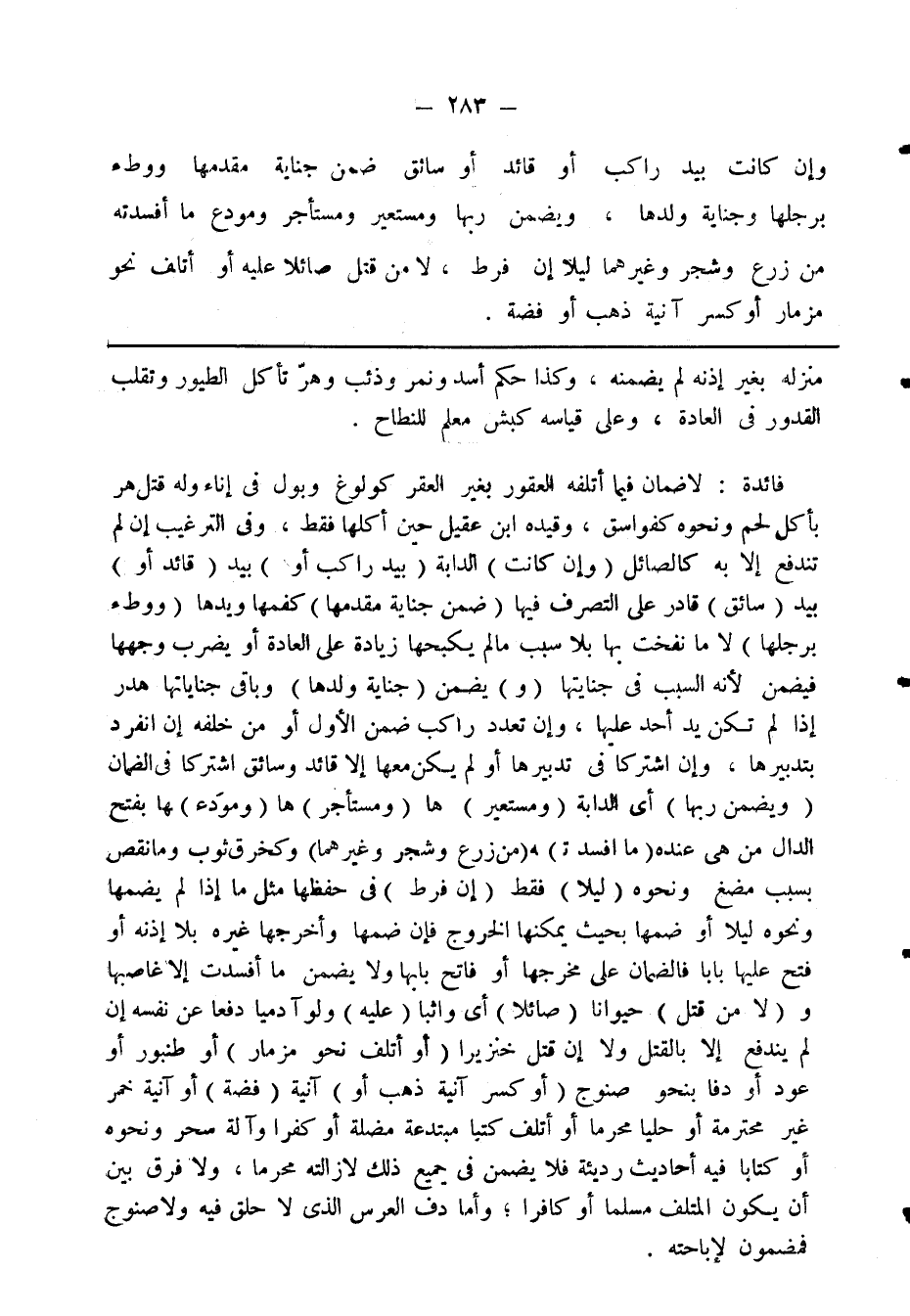 فائدة. لا ضمان فيما أتلفه العقور بغير العقر كولوغ وبول في إناء وله قتل هر يأكل لحم ونحوه كفواسق، وقيده ابن عقيل حين أكلها فقط، وقي الترغيب إن لم تندفع إلا به كالصائل (وإن كانت) الدابة (بيد راكب أو) بيد (قائد أو) بيد (سائق) قادر على التصرف فيها (ضمن جناية مقدمها) كفمها ويدها (ووطء برجلها) لا ما نفخت بها بلا سبب ما لم يكبحها زيادة على العادة أو يضرب وجهها فيضمن لأنه السبب في جنايتها (و) يضمن (جناية ولدها) وباقي جناياتها هدر إذا لم تكن يد أحد عليها، وإن تعدد راكب ضمن الأول أو من خلفه إن انفرد بتدبيرها، وإن اشتركا في تدبيرها أو لم يكن معها إلا قائد وسائق اشتركا في الضمان (ويضمن ربها) أي الدابة (ومستعير) ها (ومستأجر) ها (ومودَعـ) ـها بفتح الدال من هي عنده (ما أفسدتـ) ـه (من زرع وشجر وغيرهما) وكخرق ثوب وما نقص بسبب مضغ ونحوه (ليلا) فقط (إن فرط) في حفظها مثل ما إذا لم يضمها ونحوه ليلا أو ضمها بحيث يمكنها الخروج فإن ضمها وأخرجها وغيرها بلا إذنه أو فتح عليها بابا فالضمان على مخرجها أو فاتح بابها ولا يضمن ما أفسدت إلا غاصبها و (لا من قتل) حيوانا (صائلا) أي واثبا (عليه) ولو آدميا دفعا عن نفسه إن لم يندفع إلا بالقتل ولا إن قتل خنزيرا (أو أتلف نحو مزمار) أو طنبور أو عود أو دفا بنحو صنوج (أو كسر آنية ذهب أو) آنية (فضة) أو آنية خمر غير محترمة أو حليا محرما أو أتلف كتبا مبتدعة مضلة أو كفرا وآلة سحر ونحوه أو كتابا فيه أحاديث رديئة فلا يضمن في جميع ذلك لإزالته محرما، ولا فرق بين أن يكون المتلف مسلما أو كافرا، وأما دف العرس الذي لا حلق فيه ولا صنوج فمضمون لإباحته