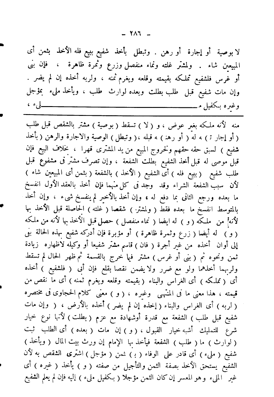 لا بوصية أو إجارة أو رهن. وتبطل بأخذ شفيع ببيع فله الأخذ بثمن أي المبيعين شاء. ولمشتر غلته ونماء منفصل وزرع وثمرة ظاهرة، فإن بنى أو غرس فلشفيع تملكه بقيمته وقلعه ويغرم ثمنه، ولربه أخذه إن لم يضر، وإن مات شفيع قبل طلب بطلت وبعده لوارث طلب، ويأخذ ملئ بمؤجل وغيره بكفيل ملئ،