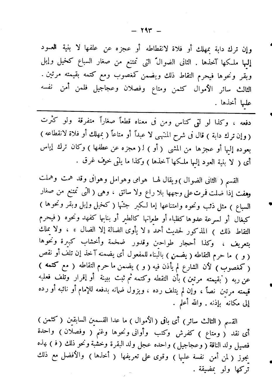 القسم (الثاني الضوال) ويقال لها هو أمي وهو أمل وهو أفي وقد همت وهملت وهفت إذا ضلت فمرت على وجهها بلا رع ولا سائق، وهي (التي تمتنع من صغار السباع) مثل ذئب ونحوه وامتناعها إما لكبر جثتها (كخيل وإبل وبقر ونحوها) كبغال أو لسرعة عدوها كظباء أو طيرانها كالطير أو بنابها كفهد ونحوه (فيحرم التقاط ذلك) المذكور لحديث أحمد «لا يأوى الضالة إلا الضال»، ولا يملك بتعريف، وكذا أحجار طواحين وقدور ضخمة وأخشاب كبيرة ونحوها (و) ما حرم التقاطه (يضمن) بالبناء للمفعول أي يضمنه آخذ إن تلف أو نقص (كمغصوب) لأن الشارع لم يأذن فيه (و) يضمن ما حرم التقاطه (مع كتمه) عن ربه (بقيمته مرتين) بأن التقطه وكتمه ثم ثبت ببينة أو إقرار وتلف فعليه قيمته مرتين نصا، وإن لم يتلف رده، ويزول ضمانه بدفعه للأمام أو نائبه أو رده إلى مكانه بإذنه. والله أعلم
