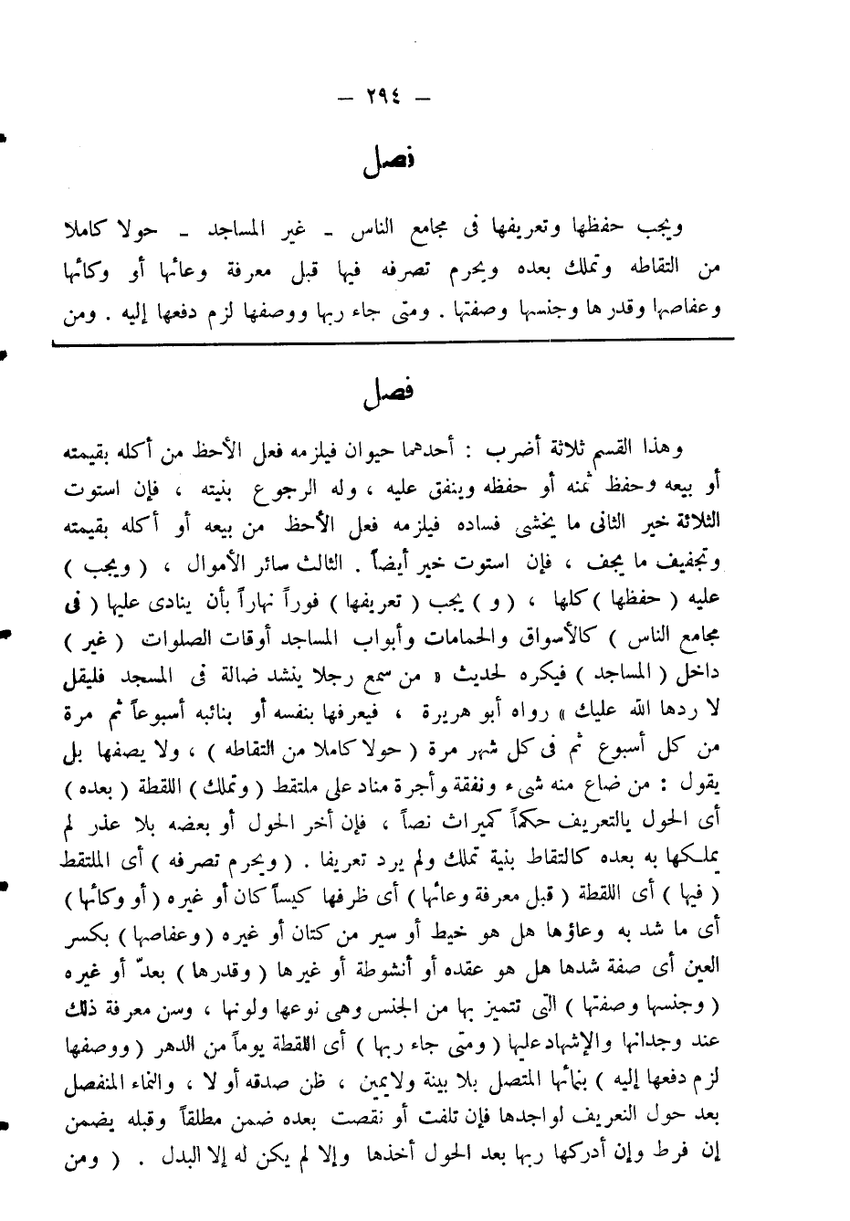 فصل ويجب حفظها وتعريفها في مجامع الناس -غير المساجد- حولا كاملا من التقاطه وتملك بعده ويحرم تصرفه فيها قبل معرفة وعائها أو كائها وعفاصها وقدرها وجنسها وصفتها. ومتى جاء ربها ووصفها لزم دفعها إليه. ومن