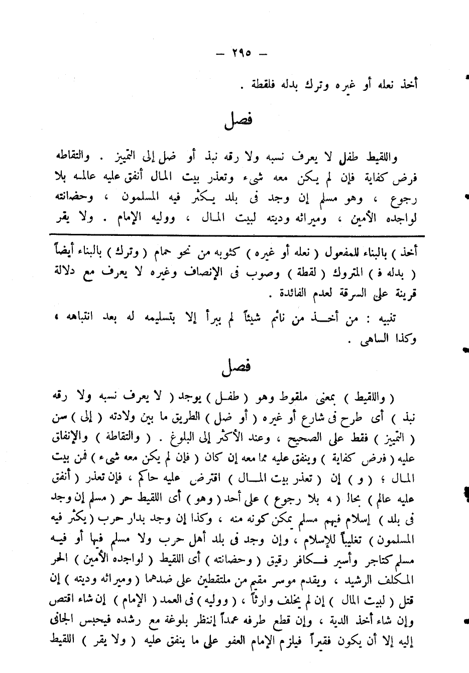 (واللقيط) بمعنى ملقوط وهو (طفل) يوجد (لا يعرف نسبه ولا رقه نبذ) أي طرح في شارع أو غيره (أو ضل) الطريق ما بين ولادته (إلى) سن (التمييز) فقط على الصحيح، وعند الأكثر إلى البلوغ. (والتقاطه) والانفاق عليه (فرض كفاية) وينفق عليه مما معه إن كان (فإن لم يكن معه شيء) فمن بيت المال، (و) إن (تعذر بيت المال) اقترض عليه حاكم، فإن تعذر (أنفق عليه عالم) بحالـ (ـه بلا رجوع) على أحد (وهو) أي اللقيط حر (مسلم إن وجد في بلد) إسلام فيهم مسلم يمكن كونه منه، وكذا إن وجد بدار حرب (يكثر فيه المسلمون) تغليبا للإسلام، وإن وجد في بلد أهل حرب ولا مسلم فيها أو فيه مسلم كتاجر وأسير فكافر رقيق (وحضانته) أي اللقيط (لواجده الأمين) الحر المكلف الرشيد، ويقدم موسر مقيم من ملتقطين على ضدهما (وميراثه وديته) إن قتل (لبيت المال) إن لم يخلف وارثا، (ووليه) في العمد (الامام) إن شاء اقتص وإن شاء أخذ الدية، وإن قطع طرفه عمدا انتظر بلوغه مع رشده فيحبس الجاني إليه إلا أن يكون فقيرا فيلزم الإمام العفو على ما ينفق عليه (ولا يقر) اللقيط