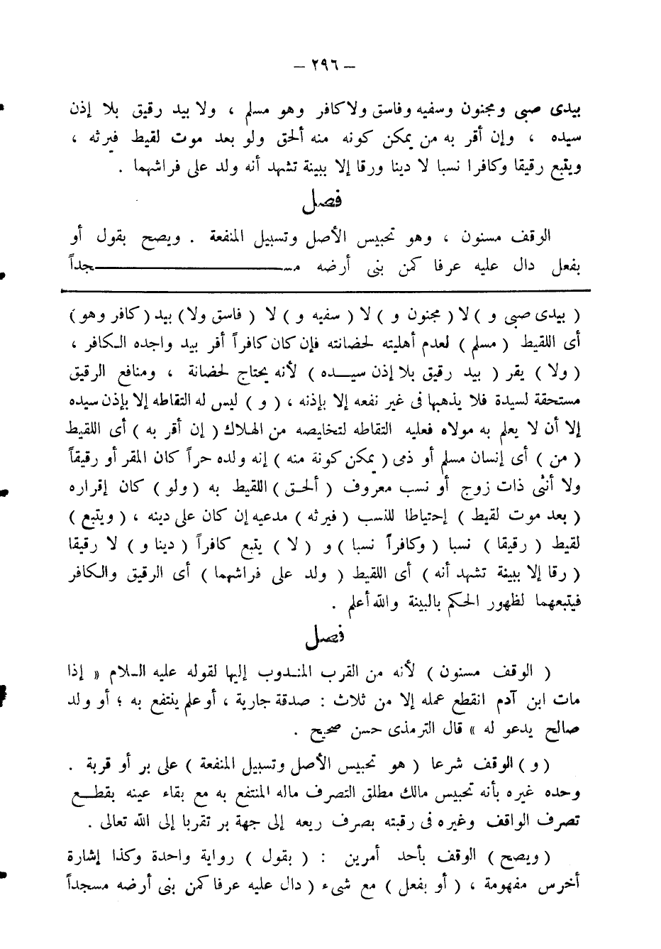 فصل الوقف مسنون، وهو تحبيس الأصل وتسبيل المنفعة. ويصح بقول أو بفعل دال عليه عرفا كمن بنى أرضه مسجدا