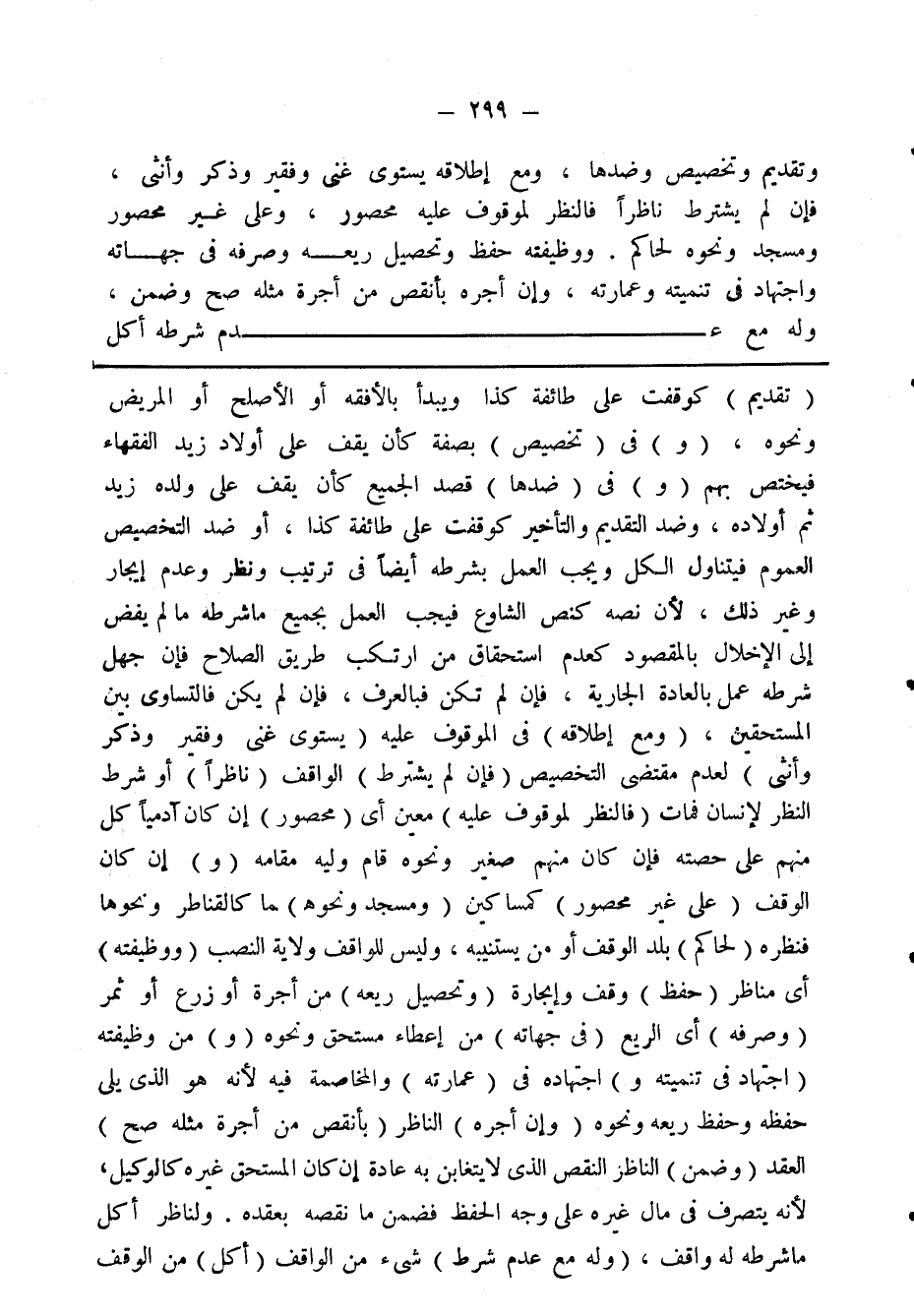 وتقديم وتخصيص وضدها، ومع إطلاقه يستوى غني وفقير وذكر وأنثى، فغن لم يشترط ناظرا فالنظر لموقوف عليه محصور، وعلى غير محصور ومسجد ونحوه لحاكم. ووظيفته حفظ وتحصير ريعه وصرفه في جهاته واجتهاد في تنميته وعمارته، وإن أجره بأنقص من أجرة مثله صح وضمن، وله مع عدم شرطه أكل