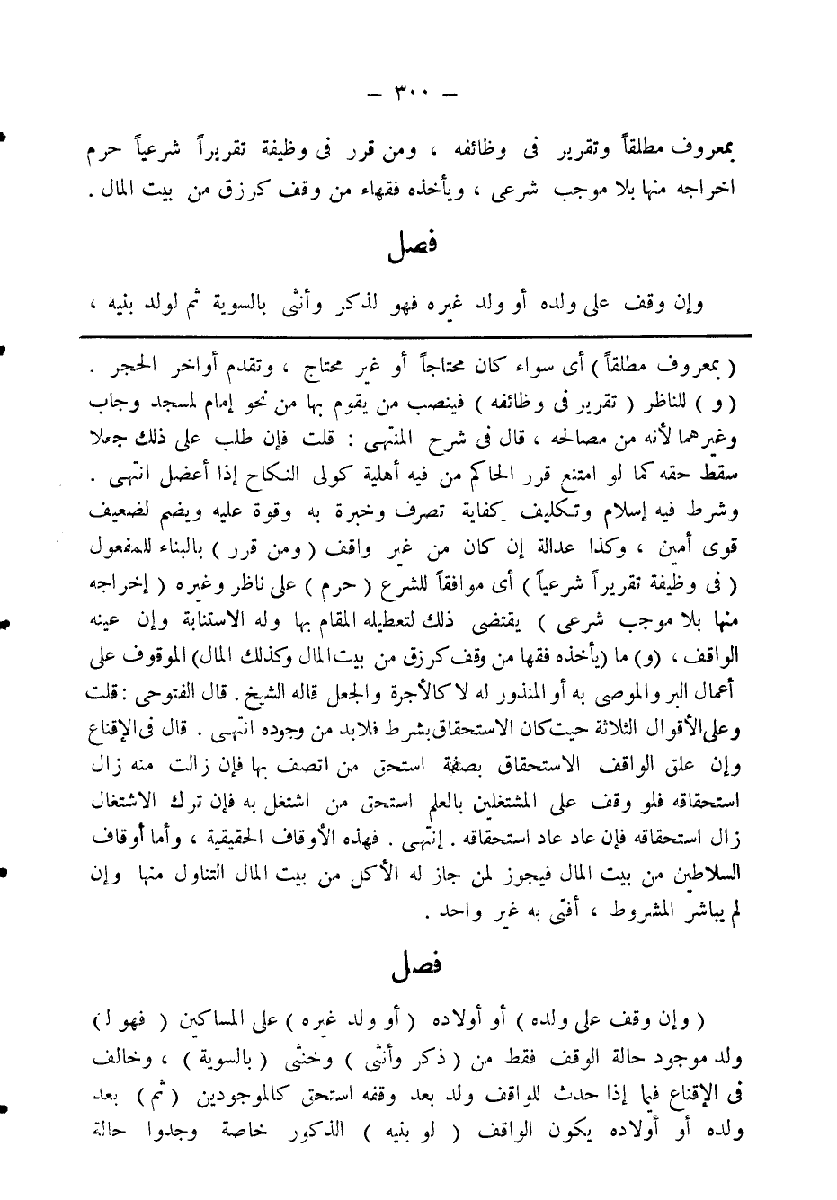(بمعروف مطلقًا) أي سواء كان محتاجا أو غير محتاج، وتقدم أواخر الحجر. (و) للناظر (تقرير في وظائفه) فينصب من يقوم بها من نحو إمام لمسجد وجاب وغيرهما لأنه من مصالحه، قال في شرح المنتهى: قلت فإن طلب على ذلك جعلا سقط حقه كما لو امتنع قرر الحاكم من فيه أهلية كولي النكاح إذا أعضل انتهى. وشرط فيه إسلام وتكليف وكفاية تصرف وخبرة به وقوة عليه ويضم لضعيف قوي أمين، وكذا عدالة إن كان من غير واقف (ومن قرر) بالبناء للمفعول (في وظيفة تقريرا شرعيا) أي موافقا للشرع (حرم) على ناظر وغيره (إخراجه منها بلا موجب شرعي) يقتضى ذلك لتعطيله المقام بها وله الاستنابة وإن عينه الواقف، (و) ما (يأخذه فقها من وقف كرزق من بيت المال) وكذلك المال الموقوف على أعمال البر والموصى به أو المنذور له لا كالأجرة والجعل قال الشيخ. قال الفتوحي: قلت وعلى الأقوال الثلاثة حيث كان الاستحقاق بشرط فلابد من وجوده انتهى. قال في الاقناع وإن علق الواقف الاستحقاق بصفة استحق من اتصف بها فإن زالت منه زال استحقاق، فلو وقف على المشتغلين بالعلم استحق من اشتغل به فإن ترك الاشتغال زال استحقاقه فإن عاد عاد استحقاقه. انتهى. فهذه الأوقاف الحقيقية، وأما أوقاف السلاطين من بيت المال فيجوز لمن جاز له الأكل من بيت المال التناول منها وإن لم يباشر المشروط، أفتى به غير واحد