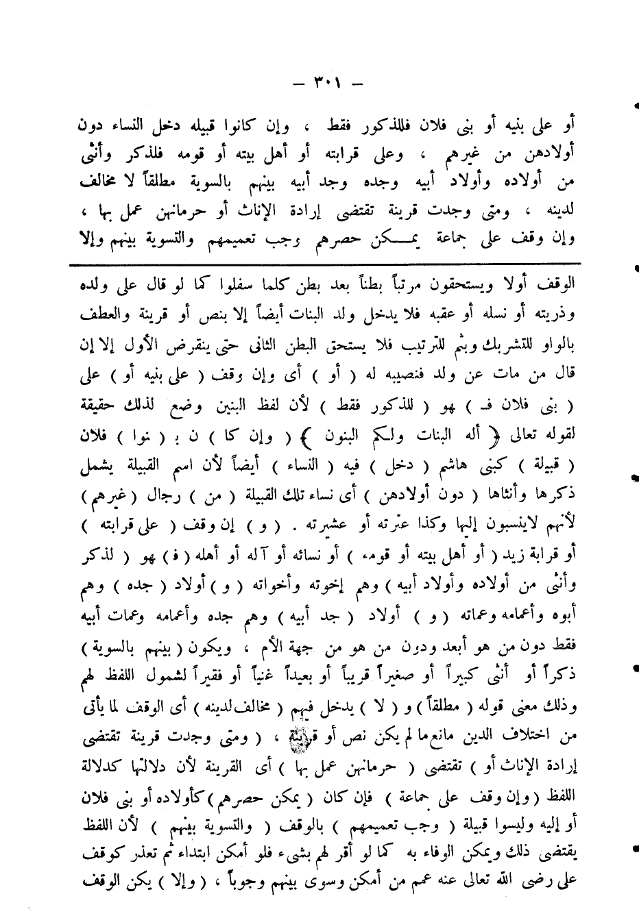 الوقف أولا ويستحقون مرتبا بطنا بعد بطن كلما سفلوا كما لو قال على ولده وذريته أو نسله أو عقبه فلا يدخل ولد البنات أيضا الا بنص أو قرينة والعطف بالواو للتشريك وبثم الترتيب فلا يستحق البطن الثانى حتى ينقرض الأول إلا إن قال من مات عن ولد فنصيبه له (أو) أى وان وقف (على بنيه أو) على (بنى فلان فـ) هو (للذكور فقط) لأن لفظ البنين وضع لذلك حقيقة لقوله تعالى {آله البنات ولكم البنون} [الطور: 38] (وان كا) ن (نوا) فلان (قبيلة) كبنى هاشم (دخل) فيه (النساء) أيضا لأن اسم القبيلة يشمل ذكرها وأنثاها (دون أولادهن) أى نساء تلك القبيلة (من) رجال (غيرهم) لأنهم لا ينسبون اليها وكذا عترته أو عشيرته. (و) إن وقف (على قرابته) أو قرابة زيد (أو أهل بيته أو قومه) أو نسائه أو آله أو أهله (فـ) هو (لذكر أو أنثى من أولاده وأولاد أبيه) وهم إخوته وأخواته (و) أولاد (جده) وهم أبوه وأعمامه (و) أولاد (جد أبيه) وهم جده وأعمامه وعمات أبيه فقط أى دون من هو أبعد ودون من هو من جهة الأم، ويكون (بينهم بالسوية) ذكر أو أنثى كبيرا أو صغيرا قريبا أو بعيدا غنيا أو فقيرا لشمول اللفظ لهم وذلك معنى قوله (مطلقا) و (لا) يدخل فيهم (مخالف ليدنه) أى الوقف لما يأتى من أن اختلاف الدين مانع ما لم يكن نص أو قرينة، (ومتى وجدت قرينة تقتضى إرادة الإناث أو) تقتضى (حرمانهن عمل بها) أى القرين لأن دلالتها كدلالة اللفظ (وإن وقف على جماعة) فان كان (يمكن حصرهم) كاولاده أو بنى فلان أو اليه وليسوا قبيلة (وجب تعميمهم) بالوقف (والتسوية بينهم) لأن اللفظ يقتضى ذلك ويمكن الوفاء به كما لو أقر لهم بشئ فلو أمكن ابتداء ثم تعذر كوقف على رضى الله تعالى عنه عمم من أمكن وسوى بينهم وجوبا، (وإلا) يكن الوقف