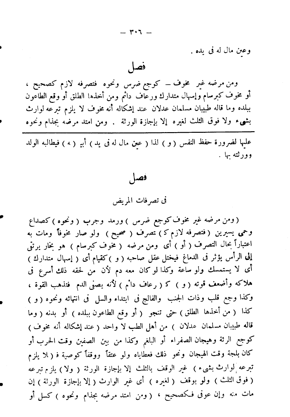 فصل ومن مرضه غير مخوف - كوجع ضرس ونحوه فتصرفه لازم كصحيح، أو مخوف كبرسام وإسهال متدارك ورعاف دائم ومن أخذها الطلق أو وقع الطاعون ببلده وما قاله طبيبان مسلمان عدلان عن إشكاله أنه مخوف لا يلزم تبرعه لوارث بشئ ولا فوق الثلث لغيره إلا باجازة الورثة. ومن امتد مرضه بجذام ونحوه