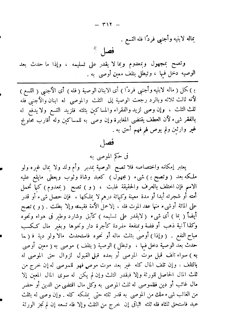 يعتبر إمكانه واختصاصه فلا تصح الوصية بمدبر وأم ولد ولا بمال غيره ولو ملكه بعد (وتصح بـ) شئ (مجهول) كعبد وشاة وثوب ويعطى ما يقع عليه الاسم فان اختلف بالعرف والحقيقة غلبت، (و) تصح (بمعدوم) كما تحمل أمته أو شجرته أبدا أو مدة معينة وكبمائة درهم لا يملكها، فان حصل شئ أو قدر على المائة أو شئ منها عند الموت فله، إلا حمل الأمة فقيمته وإلا بطلت. (و) تصح أيضا ([ما) أى شئ (لا يقدر على تسليمه) كآبق وشارد وطير فى هواء ونحوه وكذا آنية ذهب أو فضة وبمنفعة مفدرة كأجرة دار ونحوها وبغير مال ككسب مباح النفع. (وإذا) أوصى بثلث ماله أو نحوه فاستحدث مالا ولو دية فـ (ـما حدث بعد الوصية دخل فيها، وتبطل) الوصية (بتلف) موصى به (معين أوصى به) سواء تلف قبل موت الموصى أو بعده قبل القبول لزوال حق الموصى له بالتلف، وإن تلف المال كله غير بعد موت موص فهو للموصى له إن خرج من ثلث المال الحاصل للورثة وإلا فبقدر الثلث وإن لم يكن له سوى المال المعين إلا مال غائب او دين فللموصى له ثلث الموصى به وكل مال اقتضى من الدين أو حضر من الغائب شئ ملك من الموصى به قدر ثلثه جق يملكه كله. وإن وصى له بثلث عبد فاستحق ثلثاه فله ثلثه الباقى إن خرج من الثلث وإلا فله تسعه ان لم تجز الورثة