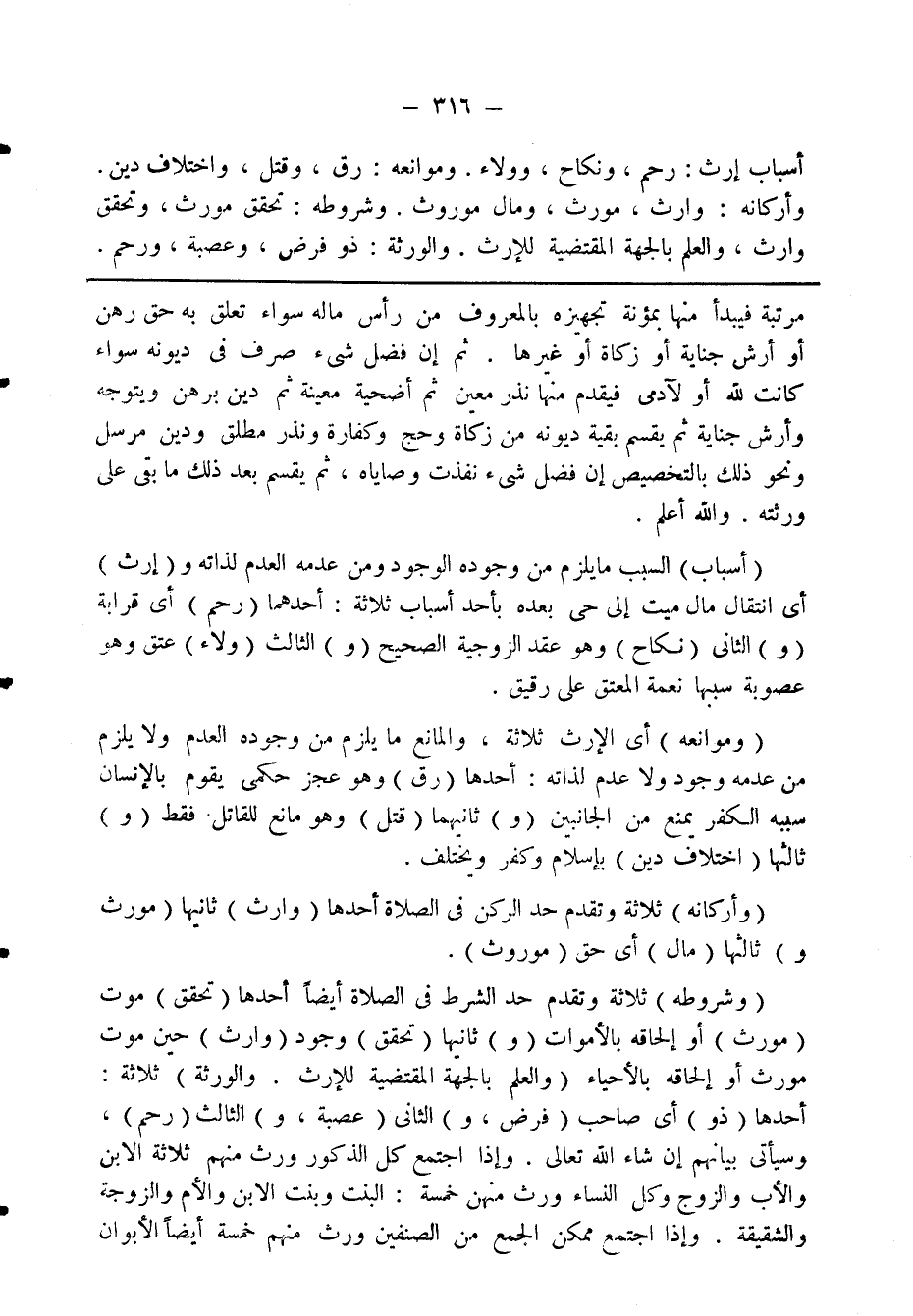 أسباب إرث: رحم، ونكاح، وولاء. وموانعه: رق، وقتل، واختلاف دين. وأركانه: وارث، مورث، ومال موروث. وشروطه: تحقق مورث، وتحقق وارث، والعلم بالجهة المقتضية للارث. والورث: ذو فرض، وعصية، ورحم.