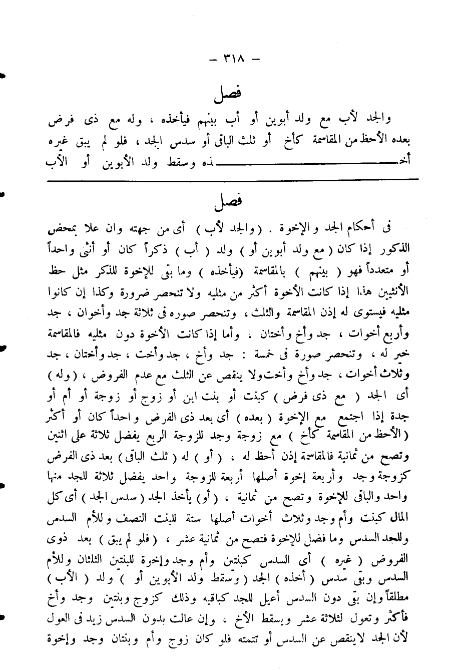 فصل في أحكام الجد والإخوة. (والجد لأب) أى من جهته وإن علا بمحض الذكور إذا كان (مع ولد أبوين أو) ولد (أب) ذكرا كان أو أنثى واحدا أو متعددا فهو (بينهم) بالمقاسمة (فيأخذه) وما بقى للإخوة للذكر مثل حظ الانثيين هذا إذا كانت الاخوة أكثر من مثليه ولا تنحصر ضرورة وكذا إن كانوا مثليه فيستوى له إذن المقاسمة والثلث، وتنحصر صورة فى ثلاثة جد وأخوان، وجد وأربع أخوات، جد وأخ وأختان، وأما إذا كانت الإخوة دون مثليه فالمقاسمة خير له، وتنحصر صورة فى خمسة: جد وأخ، جد وأخت، جد وثلاث أخوات، جد وأخ وأخت ولا ينقص عن الثلث مع عدم الفروض. (وله) أى الجد (مع ذى فرض) كبنت أو بنت ابن أو زوج أو زوجة أو أم أو جدة إذا اجتمع مع الإخوة (بعده) أى بعد ذى الفرض واحدا كان أو أكثر (الاحظ من المقاسمة كأخ) مع زوجة وجد للزوجة الربع يفضل ثلاثة على اثنين وتصح من ثمانية فالمقاسمة إذن أحظ له، (أو) له (ثلث الباقى) بعد ذى الفر كزوجة وجد وأربعة إخوة أصلها أربعة للزوجة واحد يفضل ثلاثة للجد منها واحد والباقى للاخوة وتصح من ثمانية، (أو) يأخذ الجد (سدس الجد) أى كل المال كبنت وأم وجد وثلاث أخوات أصلها ستة للبنت النصف وللأم السدس وللجد السدس وما فضل للاخوة فتصح من ثمانية عشر، (فلو لم يبق) بعد ذوى الفروض (غيره) أى السدس كبنتين وأم وجد وإخوة للبنتين الثلثان وللأم السدس وبقى سدس (أخذه) الجد (وسقط ولد الأبوين أو) ولد (الأب) مطلقا وإن بقى دون السدس أعيل للجد كباقيه وذلك كزوج وبنتين وجد وأخ فأكثر وتعول لثلاثة عشر ويسقط الأخ، وإن عالت بدون السدس زيد فى العول لأن الجد لا ينقص عن السدس أو تتمته فلو كان زوج وأم وبنتان وجد وإخوة