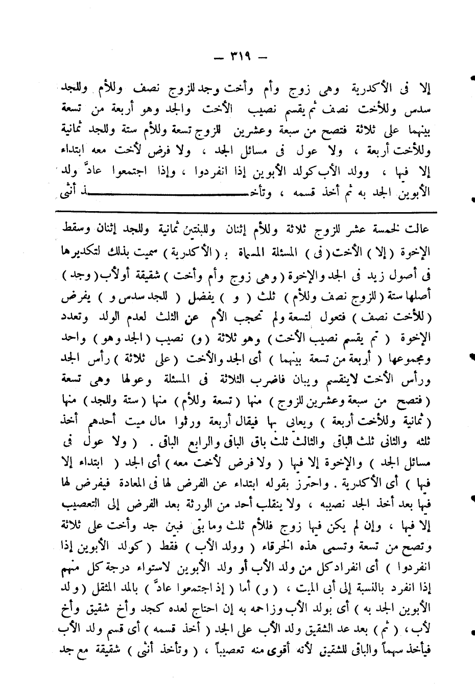 إلا في الأكدرية وهى زوج وأم وأخت وجد للزوج نصف وللأم وللجد سدس وللأخت نصف ثم يقسم نصيب الاخت والجد وهو أربعة من تسعة بينهما على ثلاثة فتصح من سبعة وعشرين للزوج تسعة وللأم ستة وللجد ثمانية وللأخت أربعة، ولا عول فى مسائل الجد، ولا فرض لاخت معه ابتداء إلا فيها، وولد الاب كولد الابوين إذا انفردوا، وإذا اجتمعوا عاد ولد الابوين الجد به ثم أخذ قسمه، وتأخذ أنثى