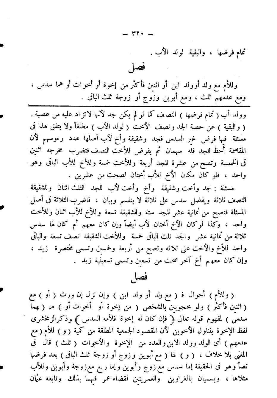 مسئلة: جد وأخت شقيقة وأخ لاب للجد الثلث اثنان وللشقيقة النصف ثلاثة ويفضل سدس على ثلاثة ينقسم وبيان، فاضرب الثلاثة فى أصل المسئلة فتصح من ثمانية عشر للجد ستة وللشقيقة تسعة وللأخ للأب اثنان وللأخت واحد، وكذا لو كان الاخ أختان لأب أيضا وإن كان معهم أم كان لها سدس ثلاثة من ثمانية عشر والجد ثلث الباقى خمسة وللأخت الشقيقة نصف تسعة والباقى واحد للأخ والاخت على ثلاثة وتصح من أربعة وخمسين وتسمى مختصرة زيد وإن كان معهم أخ آخر صحت من تسعين وتسمى تسعيلية زيد