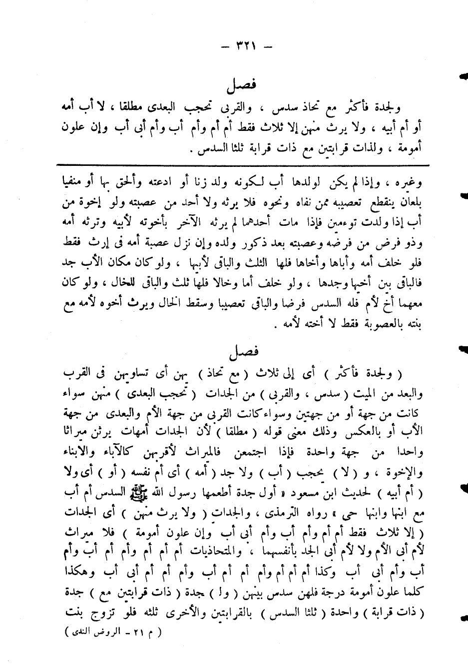 فصل ولجدة فأكثر مع تحاذ سدس، والقربى تحج البعدى مطلقا، لا أب أمه أو أم أبيه، ولا يرث منهن إلا ثلاث فقط أم أم وأم أب وأم أبى أب وإن علون أمومة، ولذات قرابتين مع ذات قرابة ثلثا السدس