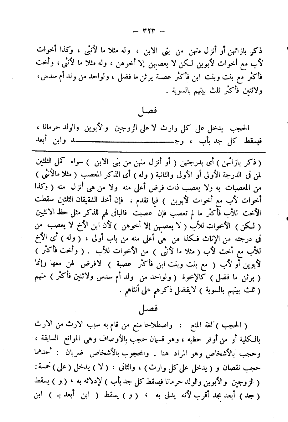 فصل الحجب يدخل على كل وارث لا على الزوجين والأبوين والولد حرمانا، فيسقط كل جد بأب، وجد وابن أبعد
