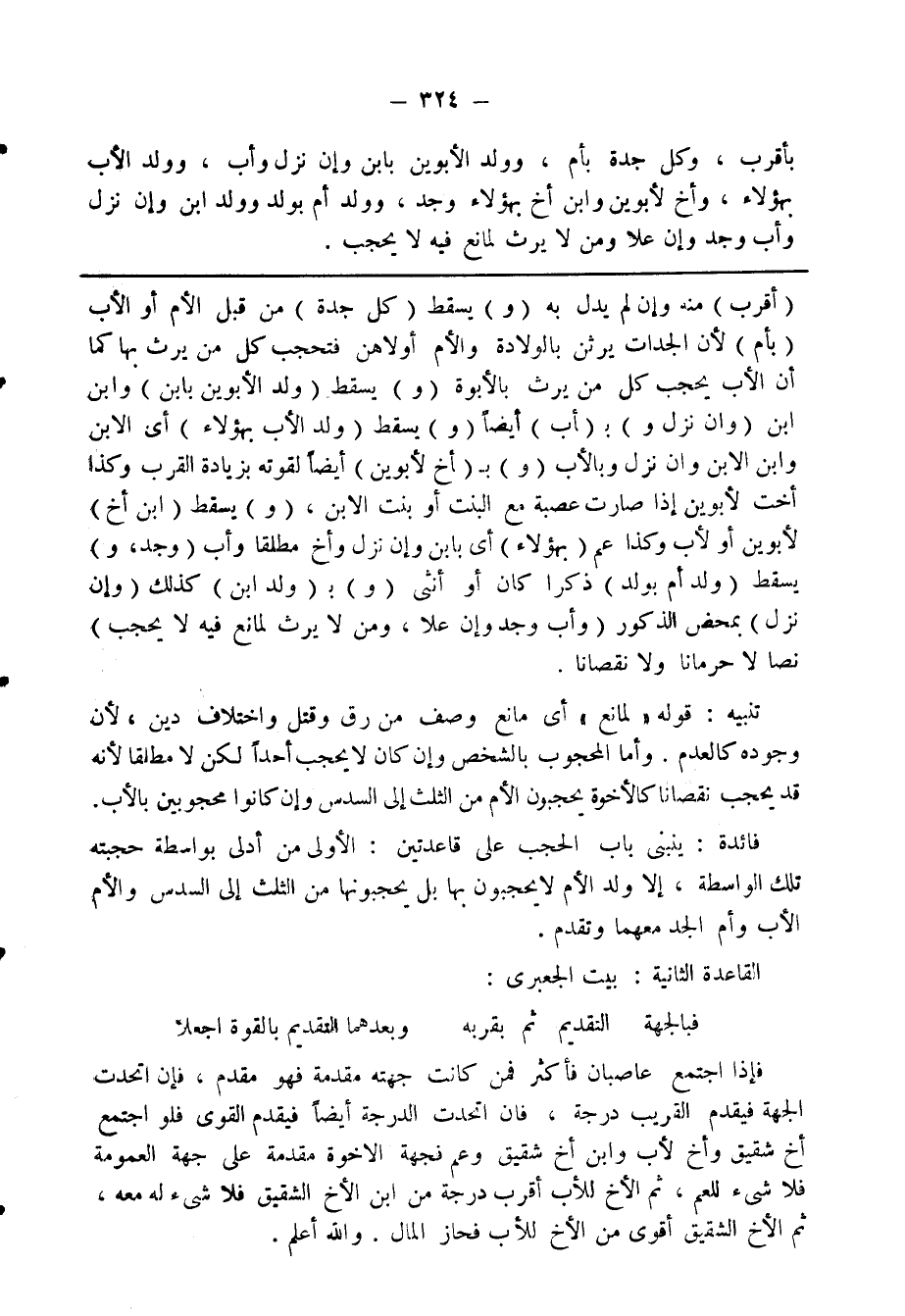فائدة: يبنى باب الحجب على قاعدتين: الأولى كل من أدلى بواسطة حجبته تلك الواسطة، إلا ولد الام لا يحجبون بها بل يحجبونها من الثلث إلى السدس والام الاب وأم الجد معهما وتقدم