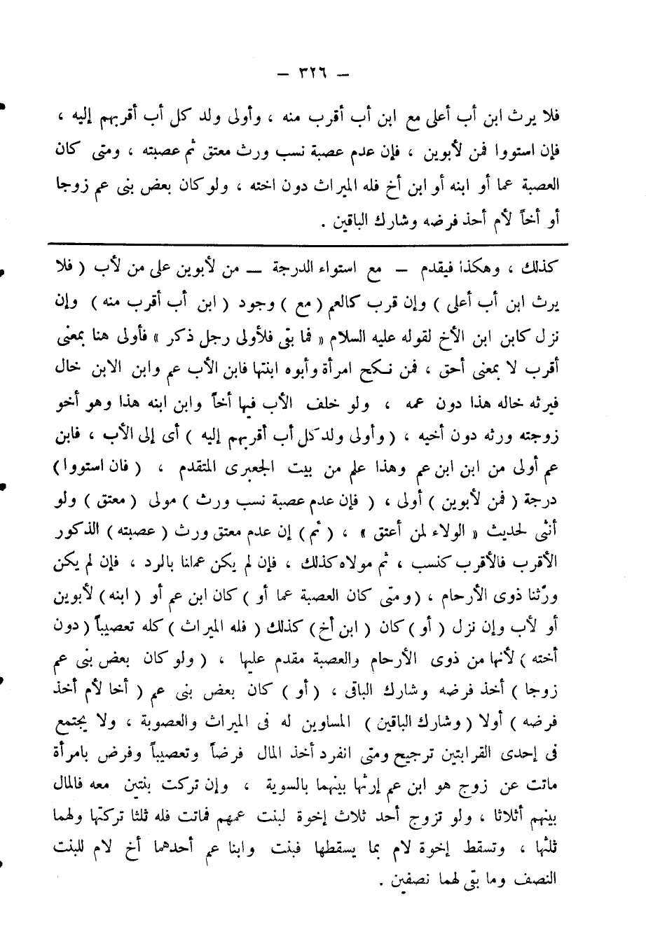 كذلك، وهكذا فيقدم - مع استواه الدرجة - من لأبوين على من لأب (فلا يرث ابن أب أعلى) وإن قرب كالعم (مع) وجود (ابن أب أقرب منه) وان نزل كابن الأخ لقوله عليه السلام «فما بقى فلأولى رجل ذكر» فأولى هنا بمعنى أقرب لا بمعنى أحق، فمن نكح امرأة وأبوه ابنتها فابن الأب عم وابن الابن خال فيرثه خاله هذا دون عمه، ولو خلف الأب فيها أخا وابن ابنه هذا وهو أخو زوجته ورثه دون أخيه، (وأولى ولد كل أب أقربهم اليه) أى إلى الأب، فابن عم أولى من ابن ابن عم وهذا علم من بيت الجعبرى المتقدم، (فان استوور) درجة (فمن لأبوين) أولى، (فان عدم عصبة نسب ورث) مولى (معتق) ولو أتى لحديث «الولاء لمن أعتق» (ثم) ان عدم معتق ورث (عصبته) الذكور الأقرب فالأقرب كنسب، ثم مولاه كذلك، فان لم يكن علمنا بالرد، فان لم يكن ورثنا ذوى الأرحام، (ومتى كان العصبة عما أو) كان ابن عم او (ابنه) لأبوين أو لأب وإن نزل (أو) كان (ابن أخ) كذلك (فله الميراث) كله تعصيبا (دون أخته) لأنها من ذوى الأرحام والعصبة مقدم عليها، (ولو مان بعض بنى عم زوجا) أخذ فرضه وشارك الباقى، (أو) كان بعض بنى عم (أخا لام أخذ فرضه) أولا (وشارك الباقين) المساوين له فى الميراث والعصوبة. ولا يجتمع فى إحدى القرابتين ترجيح ومتى انفرد أخذ المال فرضا وتعصيبا وفرض بامرأة ماتت عن زوج هو ابن عم إرثها بينهما بالسوية، وان تركت بنتين معه فالمال بينهم أثلاثا، ولو تزوج أحد ثلاث اخوة لبنت اخوة لبنت عمهم فماتت فله ثلثا تركتها ولهما ثلثها، وتسقط إخوة لام بما يسقطها فبنت وابنا عم احدهما أخ لام للبنت النصف وما بقي لهما نصفين
