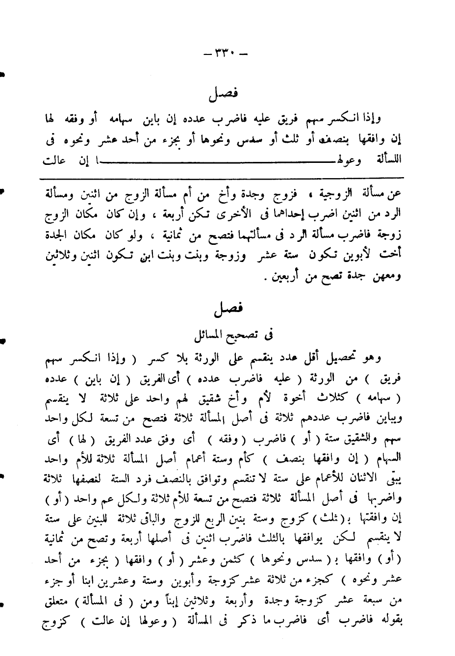 وهو تحصيل اقل عدد ينقسم على الورثة بلا كسر (وإذا انكسر سهم فريق) من الورثة (عليه فاضرب عدده) اى الفريق (إن باين) عدده (سهامه) كثلاث اخوة لأم وأخ وشقيق لهم واحد على ثلاثة لا ينقسم ويباين فاضرب عددهم ثلاثة فى اصل المسألة ثلاثة فتصح من تسعة لكل واحد سهم وللشقيق ستة (أو) فاضرب (وفقه) اى وفق عدد الفريق (لها) اى السهام (ان وافقها بنصف) كأم وستة أعمام أصل المسألة ثلاثة للأم واحد يبقى اثنان للأعمام على ستة لا تنقسم وتوافق بالنصف فرد الستة لنصفها ثلاثة واضربها فى أصل المسألة ثلاثة فتصح من تسعة للأم ثلاثة ولكل عم واحد (او) ان وافقتها بـ (ـثلث) كزوج وستة بنين لبربع للزوج والباقى ثلاثة للبنين على ستة لا ينقسم لكن يوافقها بالثلث فاضرب اثنين فى أصلها أربعة وتصح من ثمانية (أو) وافقها بـ (سدس ونحوها) كثمن وعشر (أو) وافقها (بجزء من أحد عشر ونحوه) كجزء من ثلاثة عشر كزوجة وأبوين وستة وعشرين ابنا أو جزء من سبعة عشر كزوجة وجدة وأربعة وثلاثين ابنا ومن (فى المسألة) متعلق بقوله فاضرب اى فاضرب ما ذكر فى المسألة (وعولها إن عالت) كزوج