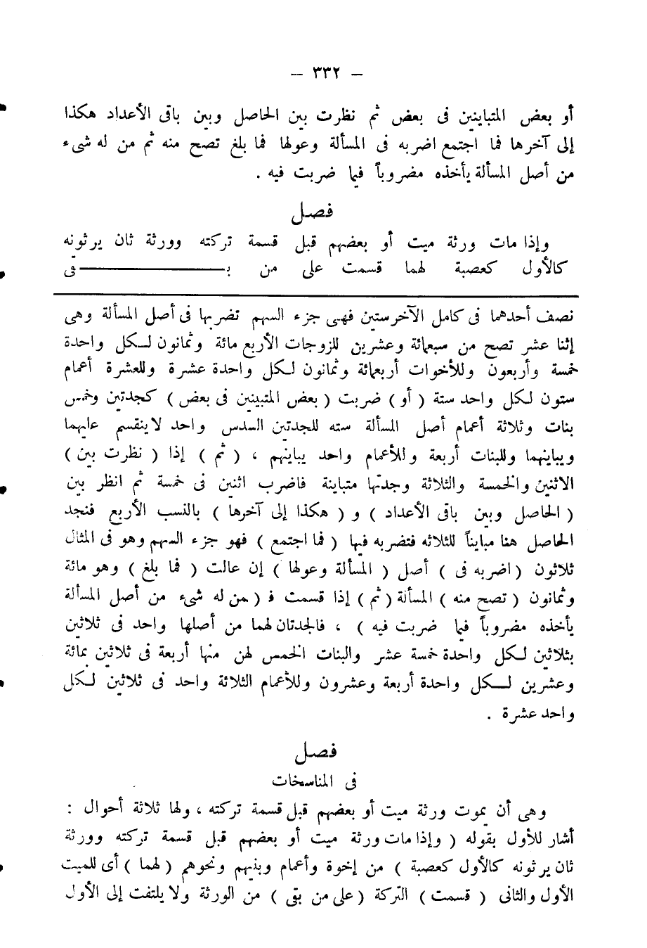 أو بعض المتباينين فى بعض ثم نظرت بين الحاصل وبين باقى الأعداد هكذا الى آخرها فما اجتمع اضربه فى المسألة وعولها فما يلغ تصح منه ثم من له شئ من أصل المسألة يأخذه مضروبا فيما ضربت فيه