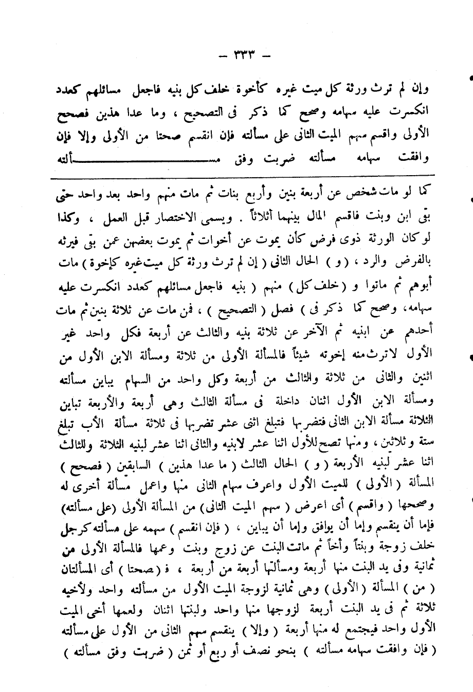 كما لو مات شخص عن أربعة بنين وأربع بنات ثم مات واحد بعد واحد حتى بقى ابن وبنت فاقسم المال بينهما أثلاثا، ويسمى الاختصار قبل العمل، وكذا لو كان الورثة ذوى فرض كأن يموت عن أخوات ثم يموت بعضهن عمن بقى فيرثه بالفرض والرد، (و) الحال الثانى (إن لم ترث ورثة كل ميت غيره كإخو) مات أبوهم ثم ماتوا و (خلف كل) منهم (بنيه فاجعل مسائلهم كعدد انكسرت عليه سهامه، وصحح كما ذكر فى) فصل (التصحيح)، فمن مات عن ثلاثة بنين ثم مات أحدهم عن ابنيه ثم الآخر عن ثلاثة بنيه والثالث عن أربعة فكل واحد غير الأول لا ترث منه إخوته شيئا فالمسألة الأولى من ثلاثة ومسألة الابن الأول من اثنين والثانى من ثلاثة والثالث من أربعة وكل واحد من السهام يباين مسالته ومسألة الابن الأول اثنان داخلة فى مسألة الثالث وهى أربعة والأربعة تباين الثلاثة مسألة الابن الثانى فتضربها فتبلغ اثنى عشر تضربها فى ثلاثة مسألة الأب تبلغ ستة وثلاثين، ومنها تصح للأول اثنا عشر لابنيه والثانى عشر لبنيه الثلاثة وللثالث اثنا عشر لبنيه الأربعة (و) الحال الثالث (ما عدا هذين) السابقين (فصحح) المسألة (الأولى) للميت الأول واعرف سهام الثانى منها واعمل مسألة أخرى له وصححها (واقسم) أى اعرض (سهم الميت الثانى) من المسألة الأولى (على مسألته) فأما أن ينقسم وإما أن يوافق وإما أن يباين، (فان انقسم) سهمه على مسألته كرجل خلف زوجة وبنتا وأخا ثم ماتت البنت عن زوج وبنت وعمها فالمسألة الأولى من ثمانية وفى يد البنت منها أربعة ومسألتها أربعة من أربعة فـ (صحتا) أى المسألتان (من) المسألة (الأولى) وهى ثمانية لزوجة الميت الأول من مسألته واحد ولأخيه ثلاثة ثم فى يد البنت أربعة لزوجها منها واحد ولبنتها اثنان ولعمها أخى الميت الأول واحد فيجتمع له منها أربعة (وإلا) ينقسم سهم الثانى من الأول على مسألته (فان وافقت سهامه مسألته) بنحو نصف أو ربع أو ثمن (ضربت وفق مسألته)