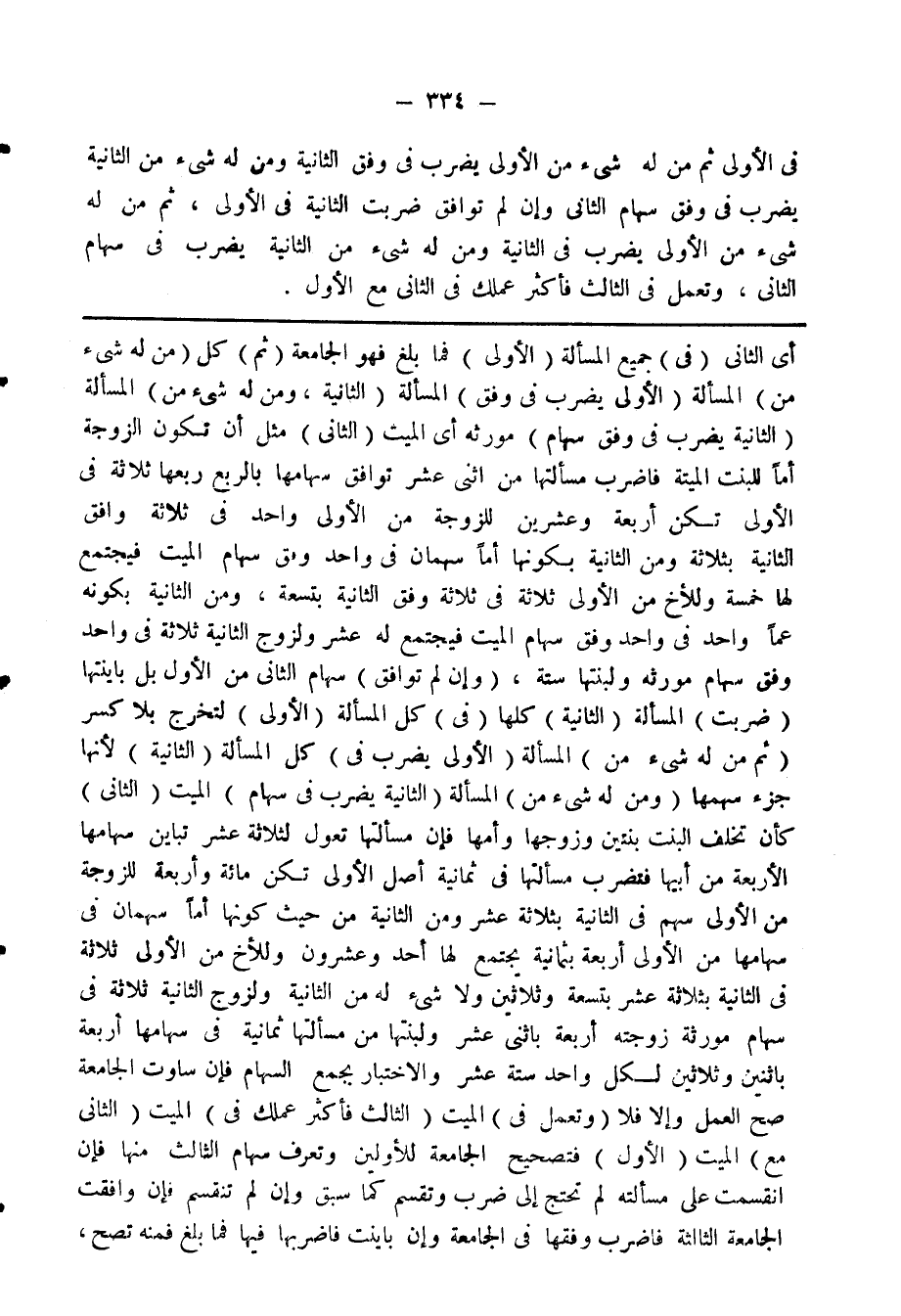 في الأولى ثم من له شئ من الأولى يضرب فى وفق الثانية ومن له شئ من الثانية يضرب فى وفق سهام الثانى وان لم توافق ضربت الثانية فى الأولى، ثم من له شئ من الأولى يضرب فى الثانية ومن له شئ من الثانية يضرب فى سهام الثانى، وتعمل فى الثالث فأكثر عملك فى الثانى مع الأول