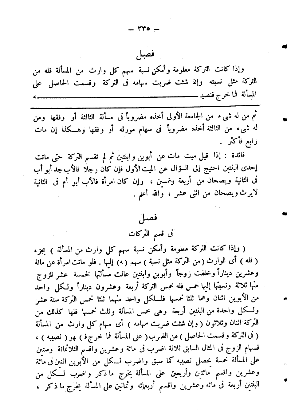 وإذا كانت التركة معلومة وأمكن نسبة سهم كل وارث من المسألة فله من التركة مثل نسبته وإن شئت ضربت سهامه فى التركة وقسمت الحاصل على المسألة فما خرج فنصيبه