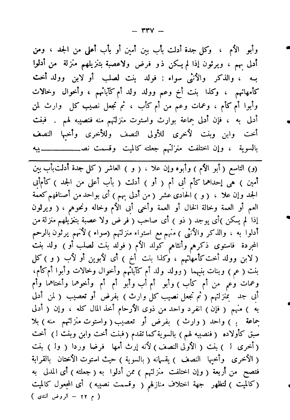 وأبو الأم، وكل جدة أدلت باب بين أمين أو بأب أعلى من الجد، ومن أدلى بهم، يرثون إذا لم ييكن ذو فرض ولا عصبة بتنزيلهم منزلة من أدلوا به، والذكر والأنثى سواء: فولد بنت لصلب أو لابن وولد أخت كأمهاتهم، وكذا بنمت أخ وعم وولد ولد كآبائهم، وأخوال وخالات وألوا أم كأم، وعمات وعم من أم كأب، ثم تجعل نصيب كل وارث لمن أدلى به، فان أدلى جماعة بوارث واستوت منزلتهم منه فتصيبه لهم: فبنت أخت وابن وبنت لأخرى للأولى النصف وللأخرى وأخيها النصف بالسوية، وإن اختلفت منزلتهم جعلته كالميت وقسمت نصيبه