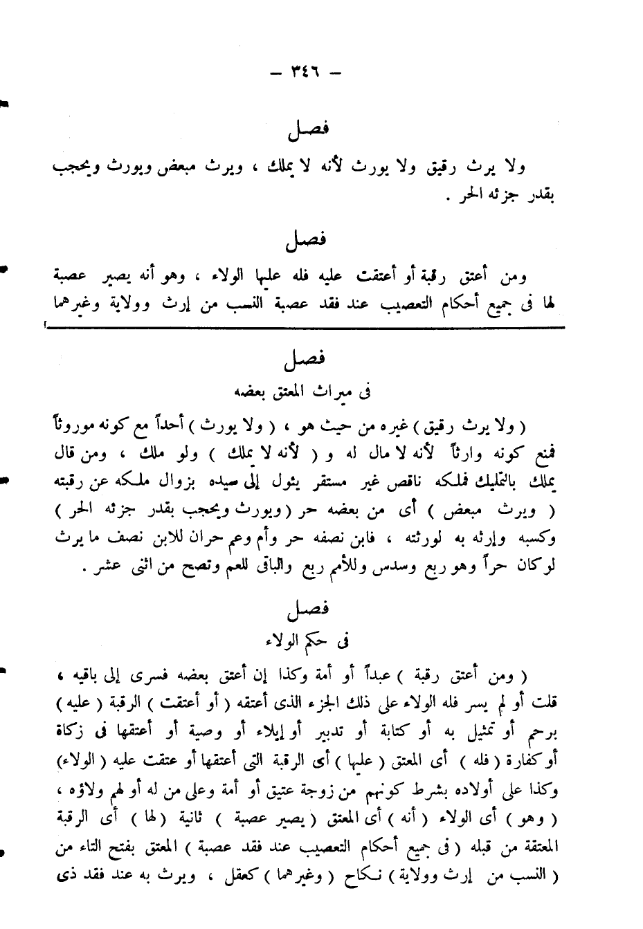 (ومن أعتق رقبة) عبدا أو أمة وكذا إن أعتق بعضه فسرى إلى باقيه، قلت أو يسر فله الولاء على ذلك الجزء الذى أعتقه (أو أعتقت) الرقبة (عليه) برحم أو تمثيل به أو كتابة أو تدبير أو إيلاء أو وصية أو أعتثها فى زكاة أو كفارة (فله) أى المعتق (عليها) أى الرقبة التى أعتقها أوعتقت عليه (الولاء) وكذت على أولاده بشرط كونهم من زوجة عتيق أو أمة وعلى من له أولهم ولاؤه، (وهو) أى الولاء (أنه) أى المعتق (يصير عصبة) ثانية (لها) أى الرقبة المعتقة من قبله (فى جميع أحكام التعصيب عند فقد عصبة) المعتق بفتح التاء من (النسب من إرث وولاية) نكاح (وغيرهما) كعقل، ويرث به عند فقد ذي