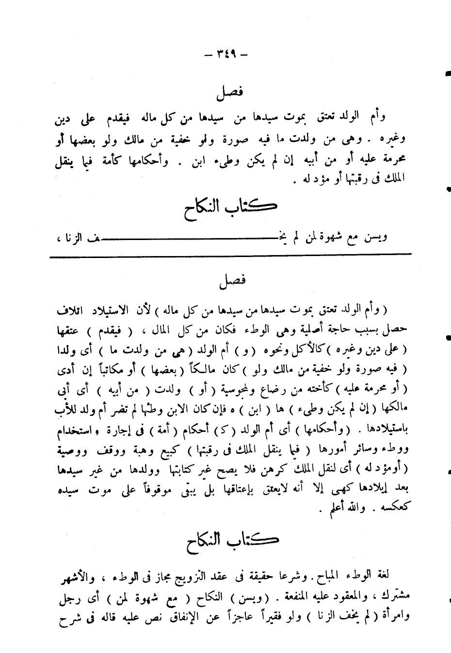 فصل وأم الولد تعتق بموت سيدها من كل ماله فيقدم على دين وغيره. وهى من ولدت ما فيه صورة ولو خفية من مالك ولو بعضها أو محرمة عليه أو من أبيه إن لم يكن وطئ ابن. وأحكامها كأمة فيما ينقل الملك فى رقبتها أو مؤد له
