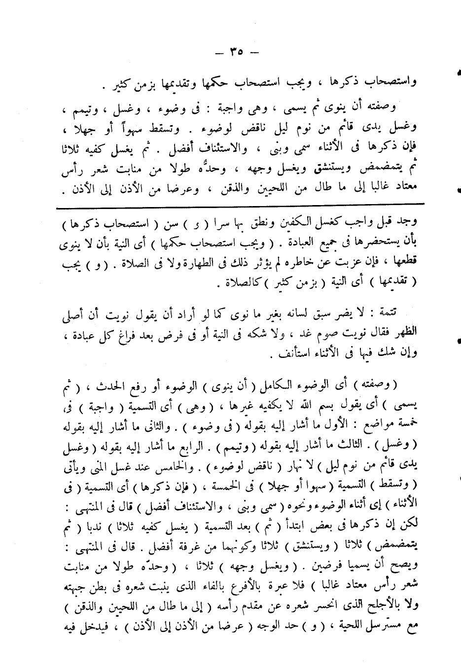 (وصفته) أي الوضوء الكامل (أن ينوي) الوضوء أو رفع الحدث، (ثم يسمي) أي يقول بسم الله لا يكفيه غيرها، (وهي) أي التسمية (واجبة) في خمسة مواضع: الأول ما أشار إليه بقوله (في وضوء)، والثاني ما أشار إليه بقوله (وغسل)، والثالث ما أشار إليه بقوله (وتيمم)، الرابع ما أشار إليه بقوله (وغسل يدي قائم من نوم ليل) لا نهار (ناقض لوضوء)، والخامس عند غسل المني ويأتي (وتسقط) التسمية (سهوًا أو جهلاً) في الخمسة، (فإن ذكرها) أي التسمية (في الأثناء) أي أثناء الوضوء ونحوه (سمى وبنى، والاستئناف أفضل) قال في المنتهى: لكن إذن ذكرها في بعض ابتدأ (ثم) بعد التسمية (يغسل كفيه ثلاثًا) ندبًا (ثم يتضمض) ثلاثًا (ويستنشق) ثلاثًا وكونهما من غرفة أفضل، قال في المنتهى: ويصح أن يسميا فرضين. (ويغسل وجهه) ثلاثًا، (وحده طولاً من منابت شعر رأس معتاد غالبًا) فلا عبرة بالأفرع بالفاء الذي ينبت شعره في بطن جبهته ولا بالأجلح الذي انحسر شعره عن مقدم رأسه (إلى ما طال من اللحيين والذقن) مع مسترسل اللحية، (و) حد الوجه (عرضًا من الأذن إلى الأذن)، فيدخل فيه