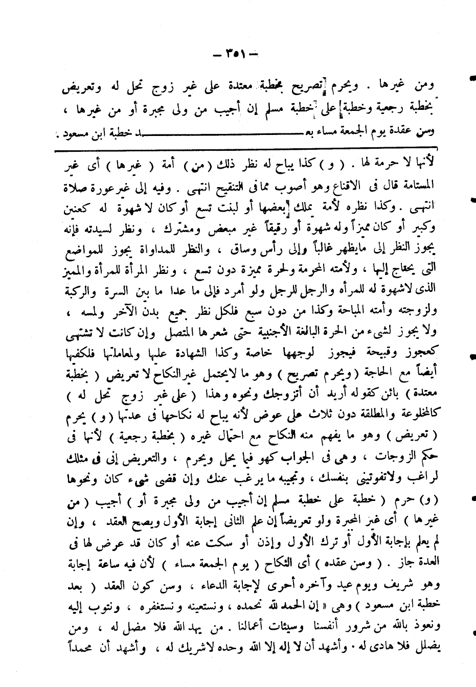 لأنها لا حرمة لها. (و) كذا يباح له نظر ذلك (من) أمة (غيرها) أي غير المستامة قال في الاقناع وهو أصوب مما في التنقيح انتهى. وفيه إلى غير عورة صلاة انتهى. وكذا نظره لأمة يملك بعضها أو لبنت تسع أو كان لا شهوة له كعنين وكبير أو كان مميزا وله شهوة أو رقيقا غير مبعض ومشترك، ونظر لسيدته فانه يجوز النظر إلى ما يظهر غالبا وإلى رأس وساق، والنظر للمداواة يجوز للمواضع التي يحتاج إليها، ولأمته المحرمة ولحرمة ولحرة مميزة دون تسع، ونظر المرأة للمرأة والمميز الذي لا شهوة له المرأة والرجل للرجل ولو أمرد فالى ما عدا ما بين السرة والركبة ولزوجته وأمته المباحة وكذا من دون سبع فلكل نظر جميع بدن الآخر ولمسه، ولا يجوز لشيء من الحرة البالغة الأجنبية حتى شعرها المتصل وان كانت لا تشتهي كعجوز وقبيحة فيجوز لوجهها خاصة وكذا للشهادة عليها ولمعاملتها فلكفيها أيضا مع الحاجة (ويحرم تصريح) وهو ما لا يحتمل غير النكاح لا تعريض (بخطبة معتدة) بائن كقوله أريد أن أتزوجك ونحوه وهذا (على غير زوج تحل له) كالمخلوعة والمطلقة دون ثلاث على عوض لأنه يباح له نكاحها في عدتها (و) يحرم (تعريض) وهو ما يفهم منه النكاح مع احتمال غيره (بخطبة رجعية) لأنها في حكم الزوجات، وهي في الجواب كهو فيما يحل ويحرم، والتعريض إنى في مثلك لراغب ولا تفوتينى بنفسك، وتجيبه ما يرغب عنك وإن قضى شيء كان ونحوها (و) حرم (خطبة على خطبة مسلم إن أجيب من ولى مجبرة أو) أجيب (من غيرها) أي غير المجبرة ولو تعريضا إن علم الثاني إجابة الأول ويصح العقد، وإن لم يعلم بإجابة الأول أو ترك الأول وإذن أو سكت عنه أو كان قد عرض لها في العدة جاز. (وسن عقده) أي النكاح (يوم الجمعة مساء) لأن فيه ساعة إجابة وهو شريف ويوم عيد وآخره أحرى لاجابة الدعاء، وسن كون العقد (بعد خطبة ابن مسعود) وهي "إن الحمد لله نحمده، ونستعينه ونستغفره، ونتوب إليه ونعوذ بالله من شرور أنفسنا وسيئات أعمالنا. من يهد الله فلا مضل له، ومن يضلل فلا هادي له. وأشهد أن لا إله إلا الله وحده لا شريك له، وأشهد أن محمدًا