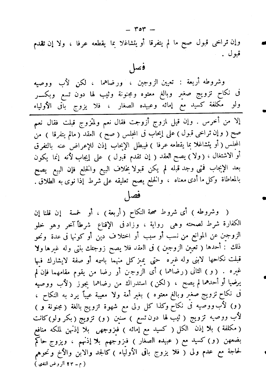 فصل وشروطه أربعة: تعيين الزوجين، ورضاهما، لكن لأب ووصيه في نكاح تزويج صغير وبالغ معتوه ومجنونة وثيب لها دون تسع وبكر ولو مكلفة كسيد مع إمائه وعبيده الصغار، فلا بزوج باقي الأولياء