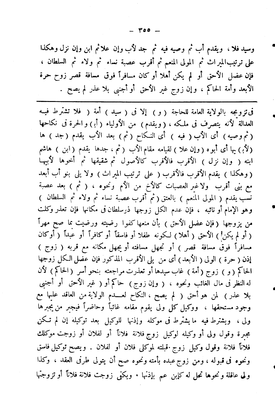 في تزويجه بالولاية العامة للحاجة (و) إلا في (سيد) أمة (فلا) تشترط فيه العدالة لأنه يتصرف في ملكه، (ويقدم) من الأولياء (أبـ) والحرة في نكاحها (ثم وصيه) أى الأب (فيه) أى النكاح (ثم) بعد الأب يقدم (جد) ها (لأبـ) يها أى أبوه (وإن علا) لقيامه مقام الأب (ثم) بعد جدها يقدم (ابن) هاثم ابنه (وان نزل) الأقرب فالأقرب كالأصول ثم شقيقها ثم أخوها لأبيها (وهكذا) يقدم الأقرب فالأقرب (على ترتيب الميراث) ولا يلى بنو أب أبعد مع بنى أب أقرب ولا غير العصبات كالأخ من الأم ونحوه، (ثم) بعد عصبة نسب يقدم (المولى المنعم) بالعتق (ثم أقرب عصبة نساء ولاء ثم السلطان) وهو الامام أو نائبه، فان عدم الكل زوجها ذو سلطان في مكانها فان تعذر وكلت من يزوجها (فان عضل الأحق) بأن منعها كفوا رضيته بما صح مهرا (أو لم يكن) الأحق (أهلا) لكونه طفلا أو فاسقا أو كافرا أو عبدا (أو كان مسافرا فوق مسافة قصر) أو تجهل مسافته أو يجهل مكانه مع قربه (زوج) إذن (حرة) الولى (الأبعد) أى من يلى الأقرب المذكور فان عضل الكل زوجها الحاكم (و) زوج (أمة) غاب سيدها أو تعذرت مراجعته بنحو أسر (الحاكم) لأن له النظر في مال الغائب ونحوه، (وإن زوج) حاكم أو (غير الأحق أو أجنبي بلا عذر) لمن هو أحق (لم يصح) النكاح لعدم الولاية من العاقد عليها مع وجود مستحقها، ووكيل كل ولى يقوم مقامه غائبا وحاضرا فيجبر من يجبرها ولى، ويشترط فيه ما يشترط في موكله واذنها للوكيل بعد توكيله ان لم تكن مجبرة وقول ولى أو وكيله لوكيل زوج فلانة فلانا أو لفلان أو زوجت موكلك فلانا فلانة وقول وكيل زوج قبلته لموكلى فلان أو لفلان. ويصح توكيل فاسق ونحوه في قبوله، ومن زوج عبده بأمته ونحوه صح أن يتولى طرفى العقد، وكذا ولى عاقلة ونحوها تحل له كابن عم باذنها، ويكفى زوجت فلانة فلانا أو تزوجتها