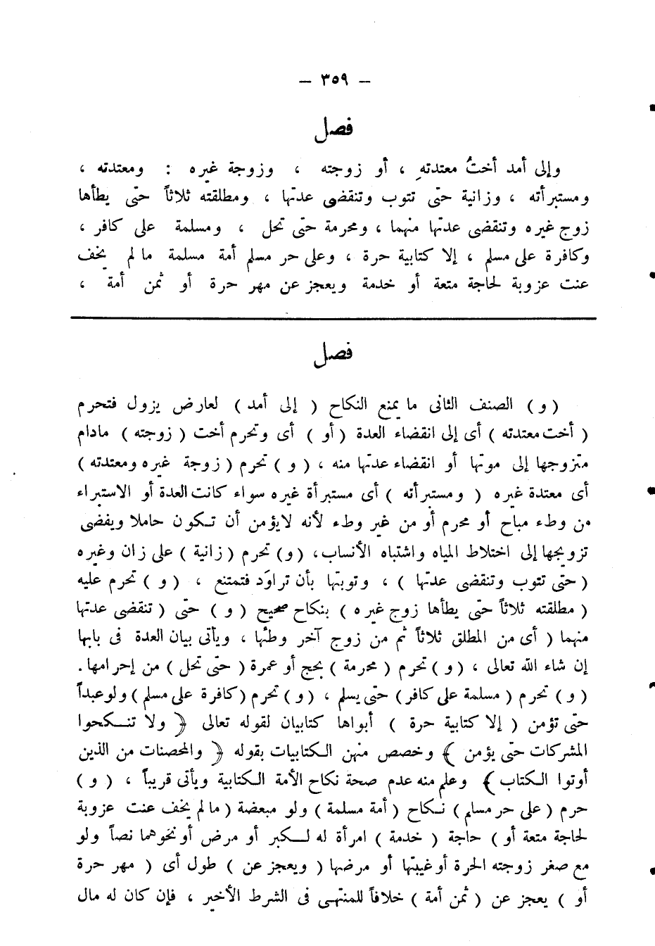 فصل وإلى أمد أختُ معتدته، أو زوجته، وزوجة غيره، ومعتدته، ومستبرأته، وزانية حتى تتوب وتنقضى عدتها، ومطلقته ثلاثا حتى يطأها زوج غيره وتنقضى عدتها منهما، ومحرمة حتى تحل، ومسلمة على كافر، وكافرة على مسلم، إلا كتابية حرة، وعلى حر مسلم أمة مسلمة ما لم يخف عنت عزوبة لحاجة متعة أو خدمة ويعجز عن مهر حرة أو ثمن أمة،