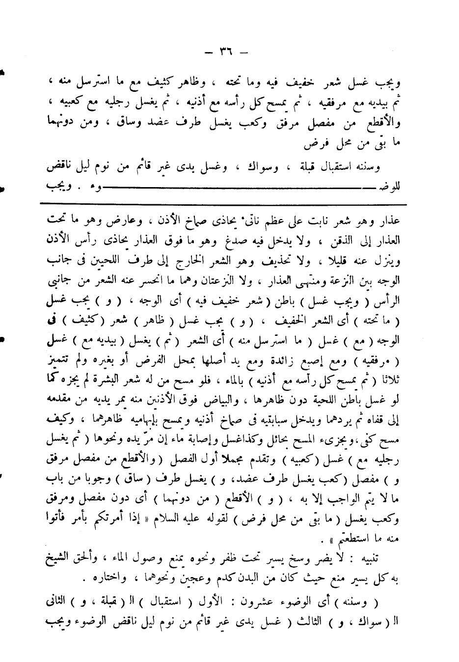عذار وهو شعر نابت على عظم ناتئ يحاذي صماخ الأذن، وعارض وهو ما تحت العذار إلى الذقن، ولا يدخل فيه صدغ وهو ما فوق العذار يحاذي رأس الأذن وينزل عنه قليلاً، ولا تحذيف وهو الشعر الخارج إلى طرف اللحيين في جانب الوجه بين النزعة ومنتهى العذار، ولا النزعتان وهما ما انحسر عنه الشعر من جانبي الرأس (ويجب غسل) باطن (شعر خفيف فيه) أي الوجه، (و) يجب غسل (ما تحته) أي الشعر الخفيف، (و) يجب غسل (ظاهر) شعر (كثيف) في الوجه (مع) غسل (ما استرسل منه) أي الشعر (ثم) يغسل (بيديه مع) غسل (مرفقيه) مع إصبع زائدة مع يد أصلها بمحل الفرض أو بغيره ولم تتميز ثلاثًا (ثم يمسح كل رأسه مع أذنيه) بالماء، فلو مسح من له شعر البشرة لم يجزه كما لو غسل باطن اللحية دون ظاهرها، والبياض فوق الأذنين منه يمر يديه من مقدمه إلى قفاه ثم يردهما ويدخل سبابتيه في صماخ أذنيه ويمسح بإبهاميه ظاهرهما وكيف مسح كفي ويجزئ المسح بحائل وكذا غسل وإصابة ماء إن مر يده ونحوها، (ثم يغسل رجليه مع) غسل (كعبيه) وتقدم مجملاً أول الفصل (والأقطع من مفصل مرفق و) مفصل (كعب يغسل طرف عضد و) يغسل طرف (ساق) وجوبًا من باب ما لا يتم الواجب إلا به، (و) الأقطع (من دونهما) أي دون مفصل ومرفق وكعب يغسل (ما بقي من محل فرض) لقوله عليه السلام: «إذا أمرتكم بأمر فأتوا منه ما استطعتم».