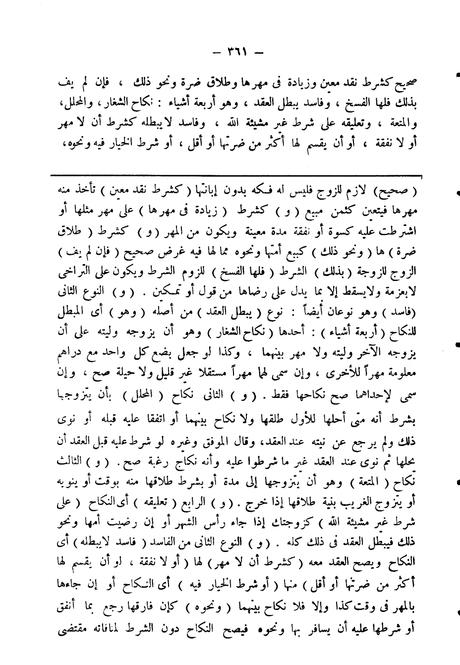 (صحيح) لازم للزوج فليس له فكه بدون إبانتها (كشرط نقد معين) تأخذ منه مهرها فيتعين كثمن مبيع (و) كشرط (زيادة في مهرها) على مهر مثلها أو اشترطت عليه كسوة أو نفقة مدة معينة ويكون من المهر (و) كشرط (طلاق ضرة) ها (ونحو ذلك) كبيع أمتها ونحوه مما لها فيه غرض صحيح (فان لم يف الزوج للزوجة (بذلك) الشرط (فلها الفسخ) للزوم الشرط ويكون على التراخى لا بعزمة ولا يسقط إلا بما يدل على رضاها من قول أو تمكين. (و) النوع الثاني (فاسد) وهو نوعان أيضا: نوع (يبطل العقد) من أصله (وهو) أى المبطل للنكاح (أربعة أشياء): أحدها (نكاح الشغار) وهو أن يزوجه وليته على أن يزوجه الآخر وليته ولا مهر بينهما، وكذا لو جعل بضع كل واحد مع دراهم معلومة مهرا للأخرى، وان سمى لهما مهراً مستقلا غير قليل ولا حيلة صح، وان سمى لاحداهما صح نكاحها فقط. (و) الثاني نكاح (المحلل) بأن يتزوجها بشرط أنه متى أحلها للأول طلقها ولا نكاح بينهما أو اتفقا عليه قبله أو نوى ذلك ولم يرجع عن نيته عند العقد، وقال الموفق وغيره لو شرط عليه قبل العقد أن يحلها ثم نوى عند العقد غير ما شرطوا عليه وأنه نكاح رغبة صح. (و) الثالث نكاح (المتعة) وهو أن يتزوجها إلى مدة أو بشرط طلاقها منه بوقت أو ينويه أو يتزوج الغريب بنية طلاقها إذا خرج. (و) الرابع (تعليقه) أى النكاح (على شرط غير مشيئة الله) كزوجتك إذا جاء رأس الشهر أو إن رضيت أمها ونحو ذلك فيبطل العقد في ذلك كله. (و) النوع الثاني من الفاسد (فاسد لا يبطله) أى النكاح ويصح العقد معه (كشرط أن لا مهر) لها (أو نفقة، أو أن يقسم لها أكثر من ضرتها أو أقل) منها (أو شرط الخيار فيه) أى النكاح أو إن جاءها بالمهر في وقت كذا وإلا فلا نكاح بينهما (ونحوه) كإن فارقها رجع بما أنفق أو شرطها عليه أن يسافر بها ونحوه فيصح النكاح دون الشرط لمنافاته مقتضى