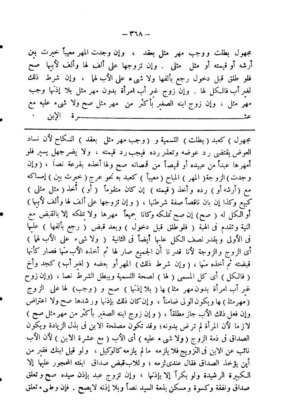 مجهول) كعبد (بطلت) التسمية و (وجب مهر مثل بعقد) النكاح لان فساد العوض يقتضى رد عوضه وتعذر رده فيجب رد قيمته، ولا يضر جهل يسير فلو أمهرها عبدا من عبيده أو قميصا من قمصانه صح ولها أخذه بقرعة نصا، (وإن وجدت) الزوجة (المهر) المباح (معيبا) كعبد به نحو عرج (خيرت بين) إمساكه مع (أرشه أو) رده وأخذ (قيمته) أن كان متقوما (أو) أخذ (مثل مثلى) كبيع وكذا إن بان ناقصا صفة شرطتها، (وان تزوجها على ألف لها وألف لأبيها) أو الكل له (صح) إن صح تملكه وكانا جميعا مهرها ولا يملكه إلا بالقبض مع النية وتقدم في الهبة (فلو طلق قبل دخول) وبعد قبض (رجع بألفها) عليها في الاولى وبقدر نصف الكل عليها أيضا في الثانية (ولا شيء على الأب لهما) أي الزوج والزوجة لانا قدرنا أن الجميع صار لها ثم أخذه الأب منها فصار كأنها قبضته ثم أخذه منها، (وان شرط ذلك) المهر أو بعضه (لغير أب) كجد وأخ (فالكل) أي كل المسمى (لها) لصحة التسمية ويبطل الشرط نصا، (وان زوج غير أب امرأة بدون مهر مثلـ) ـها (بلا إذنها) صح و (وجب) لها على الزوج (مهر مثـ) ـها ويكون الولى ضامنا، وان كان ذلك باذنها ورشدها صح ولا اعتراض، وان فعل ذلك الاب جاز مطلقا، (وان زوج ابنه الصغير بأكثر من مهر مثل صح) لازما لان المرأة لم ترض بدونه، وقد تكون مصلحة الابن في بذل الزيادة ويكون الصداق في ذمة الزوج (ولا شيء عليه) أي الاب (مع عشرة الابن) لأن الأب نائب عن الابن في التزويج فلا يلزمه ما لم يلزمه كالوكيل، ولو قيل ابنك فقير من أين يؤخذ الصداق فقال عندى لزمه، وللأب قبض صداق ابنته المحجور عليها الا الكبيرة الرشيدة ولو بكرا الا باذنها، وان تزوج عبد باذن سيده صح وتعلق صداق ونفقة وكسوة ومسكن بذمة السيد نصا وبلا اذنه لا يصح، فإن وطئ تعلق