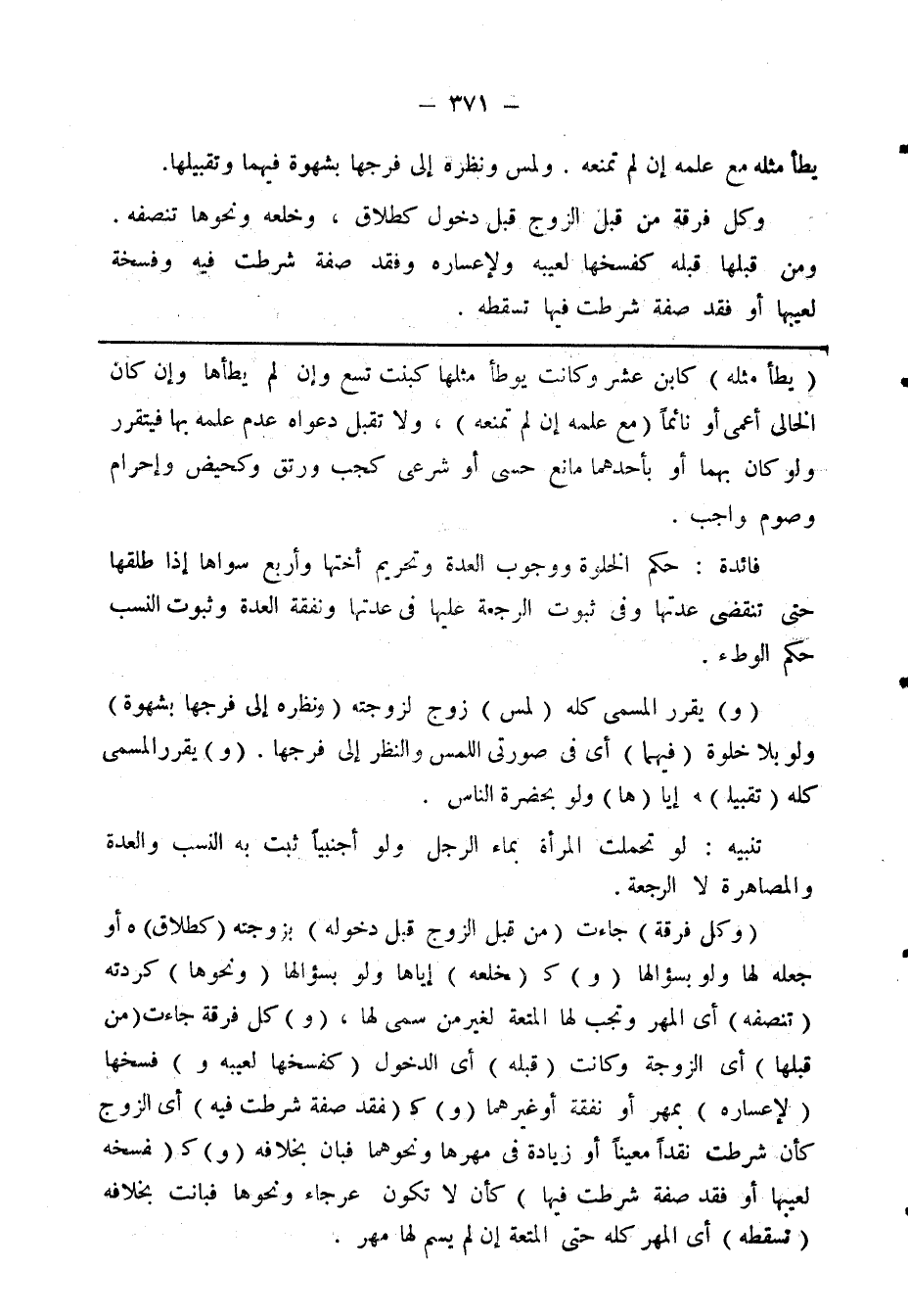 (وكل فرقة) جاءت (من قبل الزوج قبل دخوله) بزوجته (كطلاق) هـ أو جعله لها ولو بسؤالها (و) كـ (ـخلعه) اياها ولو بسؤالها (ونحوها) كردته (تنصفه) أى المهر وتجب لها المتعة لغير من سمى لها، (و) كل فرقة جاءت (من قبلها) أى الزوجة وكانت (قبله) أى الدخول (كفسخها لعيبه و) فسخها (لا عساره) بمهر أو نفقة أو غيرهما (و) كـ (ـفقد صفة شرطت فيه) أى الزوج كأن شرطت نقدا معينا أو زيادة في مهرها ونحوها ونحوهما فبان بخلافه (و) كـ (ـفسخه لعيبها أو فقد شرطت فيها) كأن لا تكون عرجاء ونحوها فباتت بخلافه (تسقطه) أى المهر كله حتى المتعة إن لم يسم لها مهر