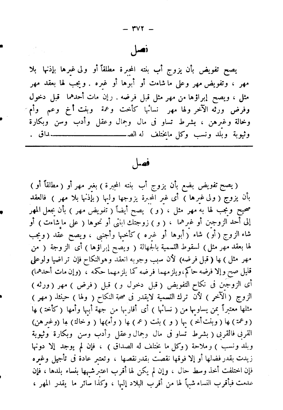 فصل يصح تفويض بأن يزوج أب بنته المجبرة مطلقا أو ولى غيرها بأذنها بلا مهر، وتفويض مهر وعلى ما شاءت أو أبوها أو غيره. ويجب لها بعقد مهر مثل، ويصح إبراؤها من مهر مثل قبل فرضه. وإن مات أحدهما قبل دخول وفرض ورثه الآخر ولها مهر نسائها كأخت وعمة وبنت أخ وعم وأم وخالة وغيرهن، بشرط تساو في مال وجمال وعقل وأدب وسن وبكارة وثيوبة وبلد ونسب وكل ما يختلف له الصداق.
