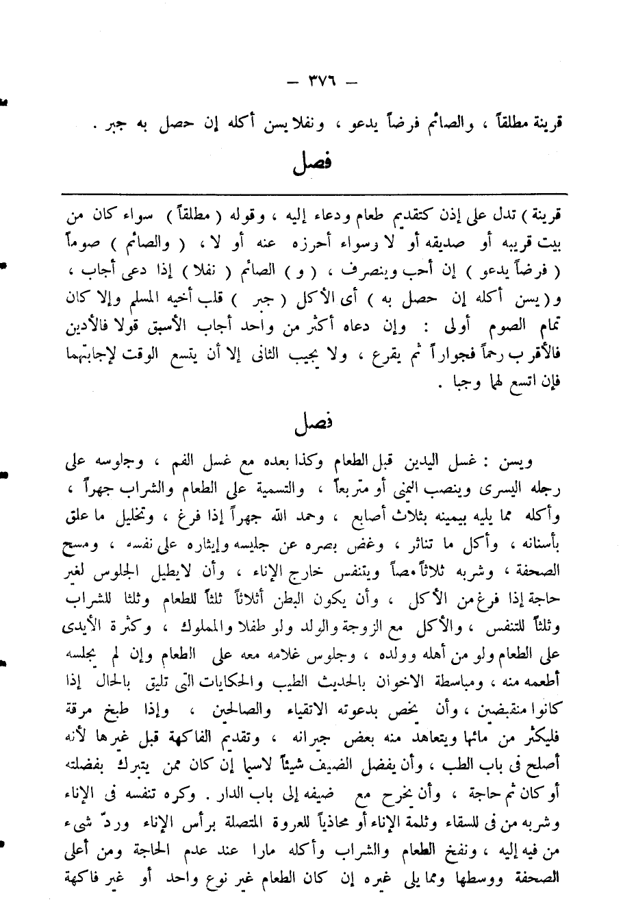 فصل ويسن: غسل اليدين قبل الطعام وكذا بعده مع غسل الفم، وجلوسه على رجله اليسرى وينصب اليمنى أو متربعا، والتسمية على الطعام والشراب جهرا، وأكله مما يليه بيمينه بثلاث أصابع، وحمد الله جهرا إذا فرغ، وتخليل ما علق بأسنانه، وأكل ما تناثر، وغض بصره عن جليسه وايثاره على نفسه، ومسح الصحفة، وشربه ثلاثا مصا ويتنفس خارج الاناء، وأن لا يطيل الجلوس لغير حاجة إذا فرغ من الأكل، وأن يكون البطن أثلاثا ثلثا للطعام وثلثا للشراب وثلثا للنفس، والأكل مع الزوجة والولد ولو طفلا والمملوك، وكثرة الأيدي على الطعام ولو من أهله وولده، وجلوس غلامه معه على الطعام وإن لم يجلسه أطعمه منه، ومباسطة الاخوان بالحديث الطيب والحكايات التي تليق بالحال إذا كانوا منقبضين، وأن يخص بدعوته الأتقياء والصالحين، وإذا طبخ مرقة فليكثر من مائها ويتعاهد منه بعض جيرانه، وتقديم الفاكهة قبل غيرها لأنه أصلح في باب الطب، وأن يفضل الضيف شيئاً لاسيما إن كان ممن يتبرك بفضلته أو كان ثم حاجة، وأن يخرج مع ضيفه إلى باب الدار، وكره تنفسه في الاناء وشربه من فى السقاء وثلمة الإناء أو محاذيا للعروة المتصلة برأس الاناء ورد شئ من فيه إليه، ونفخ الطعام والشراب وأكله مارا عند عدم الحاجة ومن أعلى الصحفة ووسطها ومما يلى غيره إن كان الطعام غير نوع واحد أو غير فاكهة