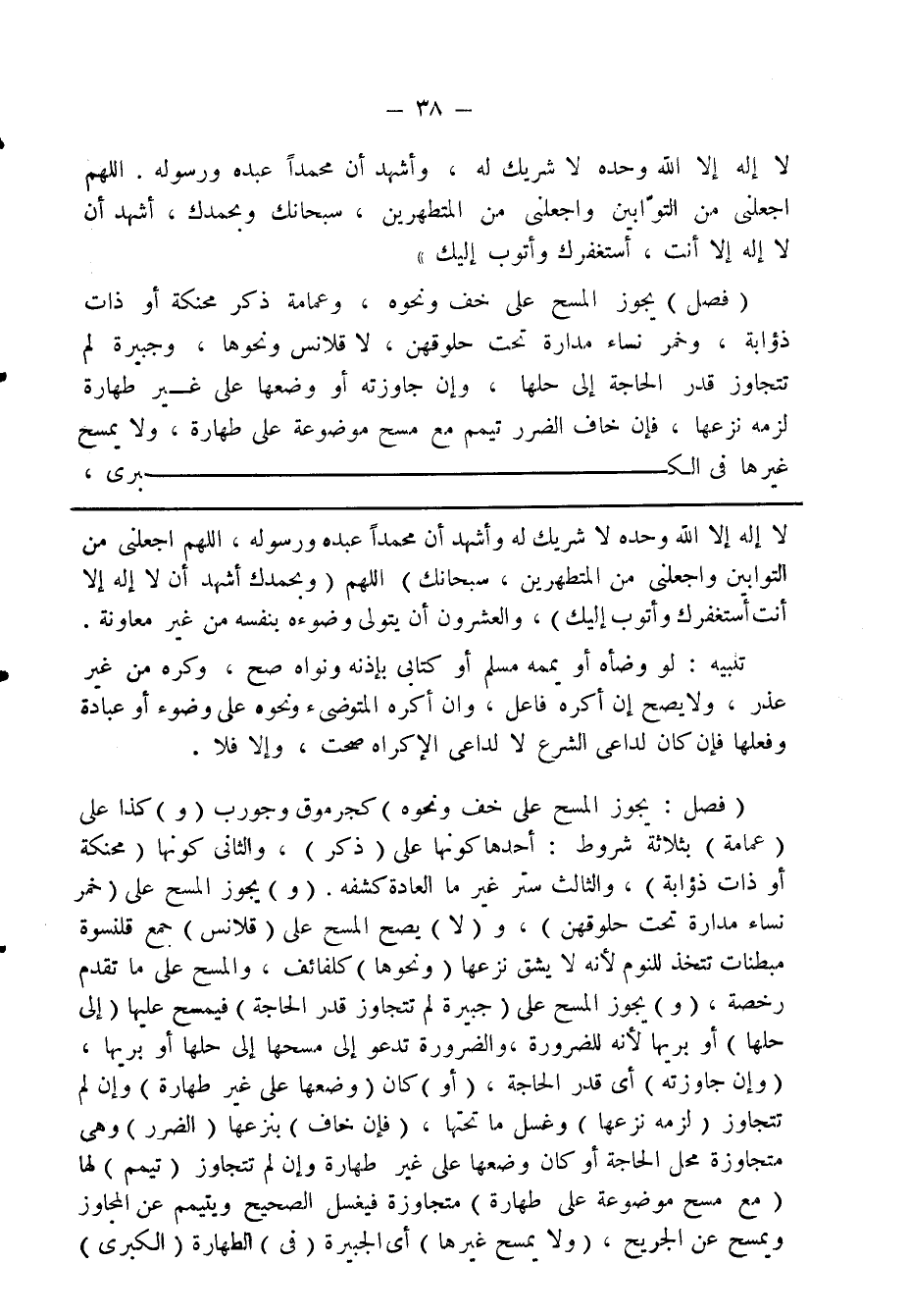 (فصل: يجوز المسح على خف ونحوه) كجرموق وجورب (و) كذا على (عمامة) بثلاثة شروط: أحدها كونها على (ذكر)، والثاني كونها (محنكة أو ذات ذؤابة)، والثالث ستر غير ما العادة كشفه. (و) يجوز المسح على (خمر نساء مدارة تحت حلوقهن)، و (لا) يصح المسح على (قلانس) جمع قلنسوة مبطنات تتخذ للنوم لأنه لا يشق نزعها (ونحوها) كلفائف، والمسح على ما تقدم رخصة، (و) يجوز المسح على (جبيرة لم تتجاوز قدر الحاجة) فيمسح عليها (إلى حلها) أو بريها لأنه للضرورة والضرورة تدعو إلى مسحها إلى حلها أو بريها، (وإن جاوزته) أي قدر الحاجة، (أو) كان (وضعها على غير طهارة) وإن لم تتجاوز (لزمه نزعها) وغسل ما تحتها، (فإن خاف) بنزعها (الضرر) وهي متجاوزة محل الحاجة أو كان وضعها على غير طهارة وإن لم تتجاوز (تيمم) لها (مع مسح موضوعة على طهارة) متجاوزة فيغسل الصحيح ويتمم عن المجاوز ويمسح عن الجريح، (ولا يمسح غيرها) أي الجبيرة (في) الطهارة (الكبرى)