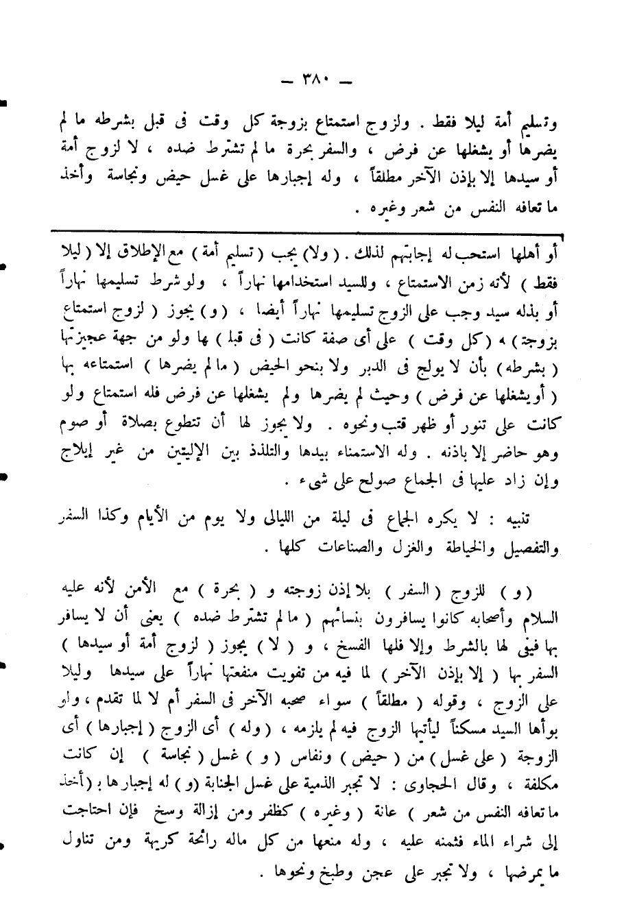وتسليم أمة ليلا فقط. ولزوج استمتاع بزوجة كل وقت فى قبل بشرطه ما لم يضرها أو يشغلها عن فرض، والسفر بحرة ما لم تشترط ضده، لا لزوج أمة أو سيدها إلا باذن الآخر مطلقا، وله إجبارها على غسل حيض ونجاسة وأخذ ما تعافه النفس من شعر وغيره