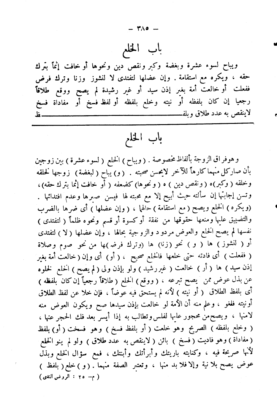وهو فراق الزوجة بألفاظ مخصوصة. (ويباح) الخلع (لسوء عشرة) بين زوجين بأن صار كل منهما كارها للآخر لا يحسن صحبته. (و) يباح (لبغضة) زوجها لخلقه وخلقه (وكبر) هـ (ونقص دين) هـ (ونحوها) كضعفه (أو خافت إثما بترك حقه)، وتسن إجابتها إن سألته حيث أبيح إلا مع محبته لها فيسن صبرها وعدم افتدائها. (ويكره) الخلع ويصح (مع استقامة) حالهما، (وإن عضلها) أى ضرها بالضرب والتضييق عليها ومنعها حقوقها من نفقة أو كسوة أو قسم ونحوه ظلما (لتفتدى) نفسها لم يصح الخلع والعوض مردود والزوجية بحالها، وإن عضلها (لا) لتفتدى أو (لنشوز) ها (و) نحو (زنا) ها (وترك فرضـ) ـها من نحو صوم وصلاة (ففعلت) أى فادته حتى خلعها فالخلع صحيح، (أو) أى وإن (خالعت أمة بغير إذن سيد) ها (أو) خالعت (غير رشيد) ولو بإذن ولى (لم يصح) الخلع لخلوه عن بذل عوض ممن يصح تبرعه، (ووقع) الخلع (طلاقا رجعيا إن كان بلفظه) أى بلفظ الطلاق (أو نيته) لأنه لم يستحق فيه عوضا، فإن خلا عن لفظ الطلاق أو نيته فلغو، وعلم منه أن الأمة لو خالعت بإذن سيدها صح ويكون العوض منه لا منها، ويصح من محجور عليها لفلس وتطالب به إذا أيسر بعد فك الحجر عنها، (وخلع بلفظه) الصريح وهو خلعت (أو بلفظ فسخ) وهو فسخت (أو) بلفظ (مفاداة) وهو فاديت (فسخ) بائن (لا ينقص به عدد طلاق) ولو لم ينو الخلع لأنها صريحة فيه، وكنايته باريتك وأبرأتك وأبنتك، فمع سؤال الخلع وبذل عوض يصح بلا نية وإلا فلابد منها، وتعتبر الصفة منهما. (و) خلع (بلفظ)