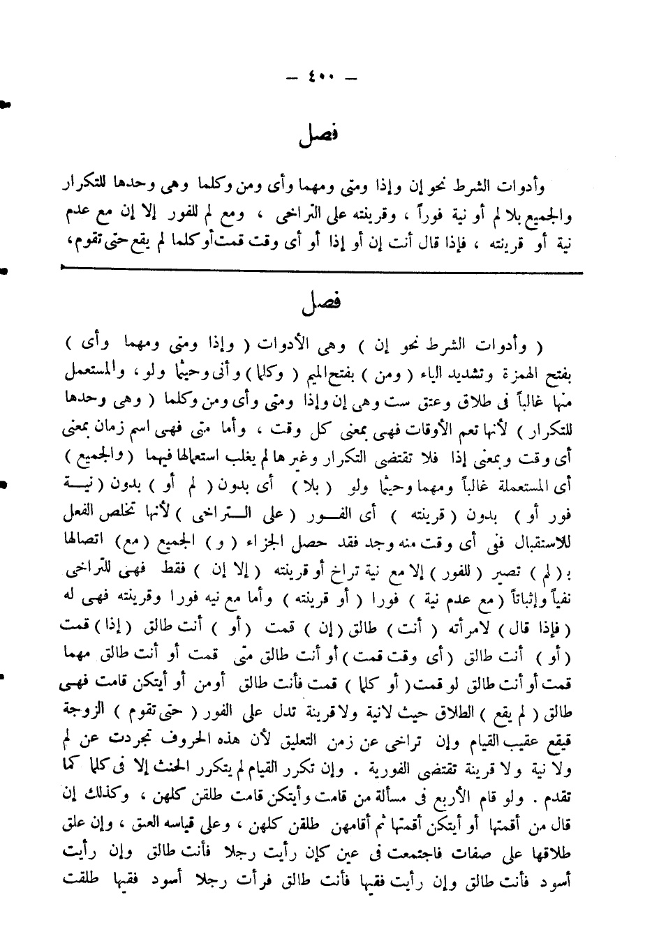 فصل وأدوات الشرط نحو إن وإذا ومتى ومهما وأي ومن وكلما وهى وحدها للتكرار والجميع بلا لم أو نية فوراً، وقرينته على التراخى، ومع لم للفور إلا إن مع عدم نية أو قرينته، فاذا قال أنت إن أو أى وقت قمت أو كلما لم يقع حتى تقوم،
