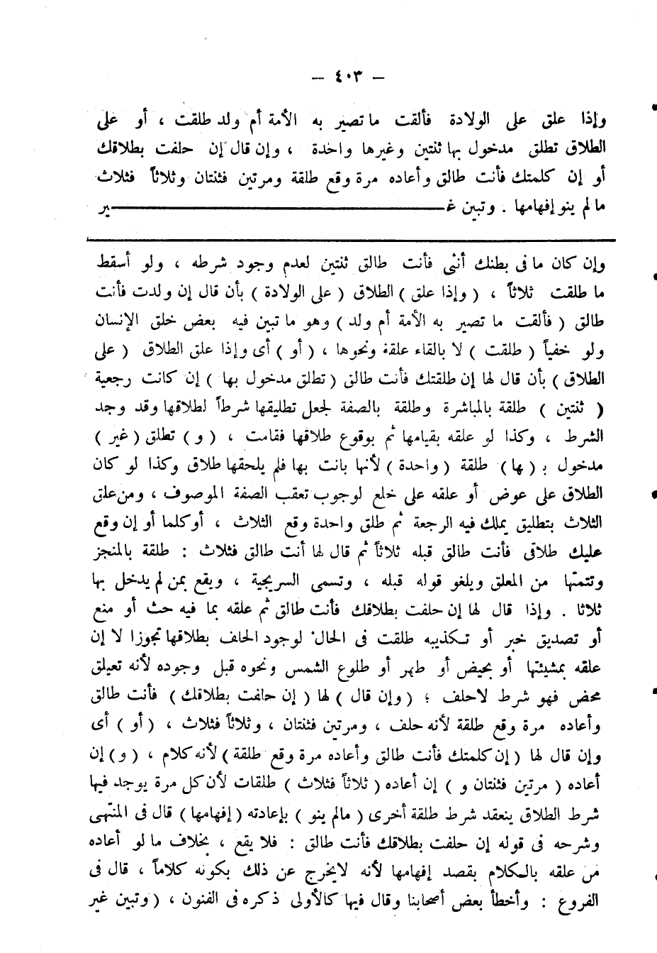 وإن كان ما في بطنك أنثى فأنت طالق ثنتين لعدم وجود شرطه، ولو أسقط ما طلقت ثلاثا، (وإذا علق) الطلاق (على الولادة) بأن قال إن ولدت فأنت طالق (فألقت ما تصير به الأمة أم ولد) وهو ما تبين فيه بعض خلق الإنسان ولو خفيا (طلقت) لا بالقاء علقة ونحوها، (أو) أي وإذا علق الطلاق (على الطلاق) بأن قال لها إن طلقتك فأنت طالق (تطلق مدخول بها) إن كانت رجعية (ثنتين) طلقة بالمباشرة وطلقة بالصفة لجعل تطليقها شرطا لطلاقها وقد وجد الشرط، وكذا لو علقه بقيامها ثم بوقوع طلاقها فقامت، (و) تطلق (غير) مدخول: (بها) طلقة (واحدة) لأنها بانت بها فلم يلحقها طلاق وكذا لو كان الطلاق على عوض أو علقة على خلع لوجوب تعقب الصفة الموصوف، ومن علق الثلاث بتطليق يملك فيه الرجعة ثم طلق واحدة وقع الثلاث، أو كلما أو إن وقع عليك طلاقي فأنت طالق قبله ثلاثا ثم قال لها أنت طالق فثلاث: طلقة بالمنجز وتتمتها من المعلق ويلغو قوله قبله، وتسمى السريجية، ويقع بمن لم يدخل بها ثلاثا. وإذا قال لها إن حلفت بطلاقك فأنت طالق ثم علقه بما فيه حث أو منع أو تصديق خبر أو تكذيبه طلقت في الحال لوجود الحلف بطلاقها تجوزا لا إن علقه بمشيئتها أو بحيض أو طهر أو طلوع الشمس ونحوه قبل وجوده لأنه تعليق محض فهو شرط لا حلف، (وإن قال) لها (إن حلفت بطلاقك) فأنت طالق وأعاده مرة وقع طلقة لأنه حلف، ومرتين فثنتان، وثلاثا فثلاث، (أو) أي وإن قال لها (إن كلمتك فأنت طالق وأعاده مرة وقع طلقة) لأنه كلام، (و) إن أعاده (مرتين فثنتان و) إن أعاده (ثلاثا فثلاث) طلقات لأن كل مرة يوجد فيها شرط الطلاق ينعقد شرط طلقه أخرى (ما لم ينو) بإعادته (إفهامها) قال في المنتهى وشرحه في قوله إن حلفت بطلاقك فأنت طالق: فلا يقع، بخلاف ما لو أعاده من علقه بالكلام بقصد إفهامها لأنه لا يخرج عن ذلك بكونه كلاما، قال في الفروع: وأخطأ بعض أصحابنا وقال فيها كالأولى ذكره في الفنون، (وتبين غير