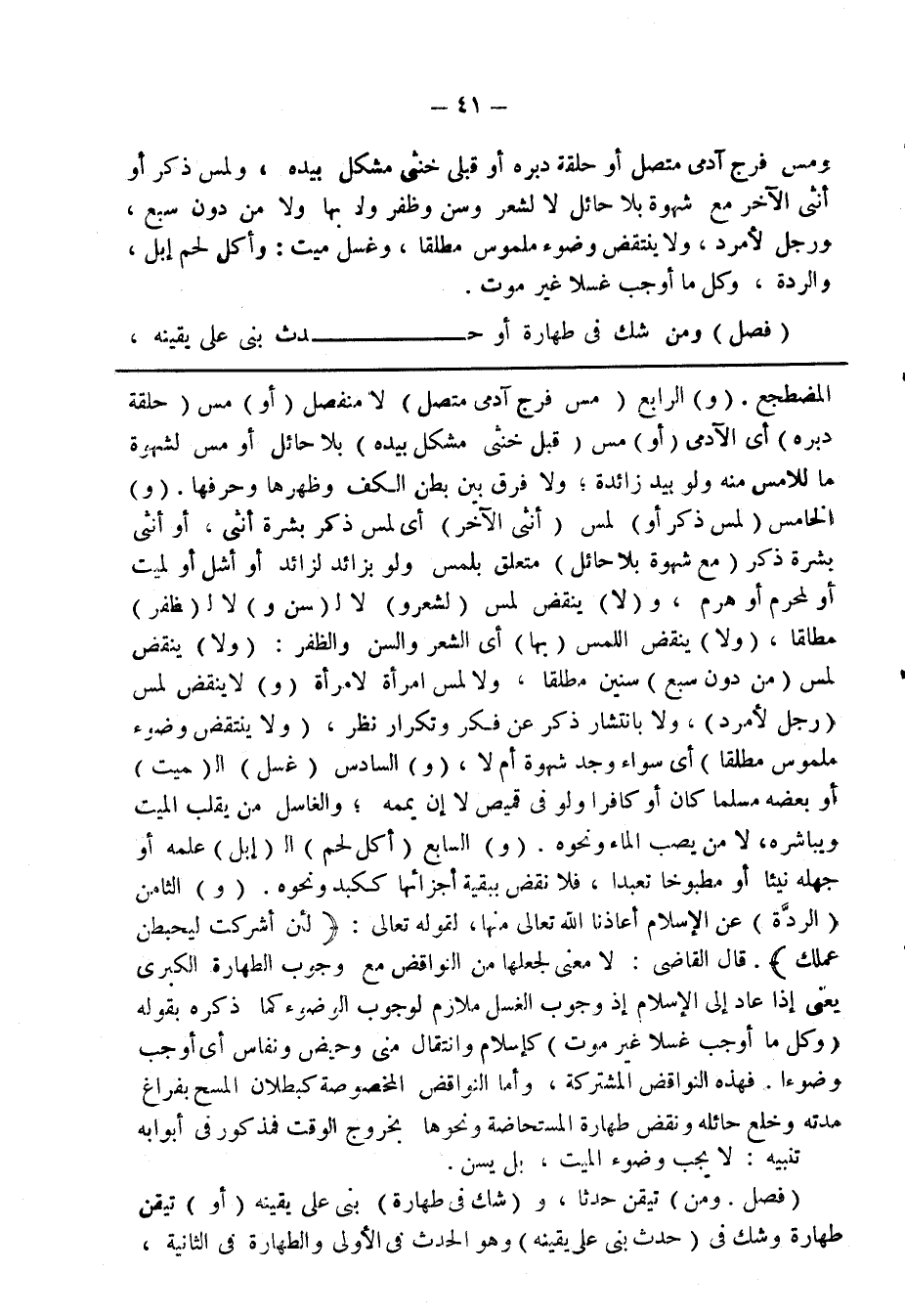 المضطجع، (و) الرابع (مس فرج آدمي متصل) لا منفصل (أو) مس (حلقة دبره) أي الآدمي (أو) مس (قبلى خنثى مشكل بيده) بلا حائل أو مس لشهوة ما للأمس منه ولو بيد زائدة، ولا فرق بين بطن الكف وظهرها وحرفها، (و) الخامس (لمس ذكر أو) لمس (أنثى الآخر) أي لمس ذكر بشرة أنثى أو أنثى بشرة ذكر (مع شهوة بلا حائل) متعلق بلمس ولو بزائد لزائد أو أشل أو لميت أو لمحرم أو هرم، و (لا) ينقض لمس (لشعر و) لا (لسن و) لا (لظفر) مطلقًا، (ولا) ينقض اللمس (بها) أي الشعر والسن والظفر، (ولا) ينقض لمس (من دون سبع) سنين مطلقًا، ولا لمس امرأة لامرأة، (و) لا ينقض لمس (رجل لأمرد)، ولا بانتشار ذكر عن فكر وتكرار نظر، (ولا ينتقض وضوء ملموس مطلقًا) أي سواء وجد شهوة أم لا، (و) السادس (غسل) (الميت) أو بعضه مسلمًا كان أو كافرًا ولو في قميص لا إن يممه، والغاسل من يقلب الميت ويباشره لا من يصب الماء ونحوه، (و) السابع (أكل لحم) (الإبل) علمه أو جهله نيئًا أو مطبوخًا تعبدًا لا نقض ببقية أجزائها ككبد ونحوه، (و) الثامن (الردة) عن الإسلام أعاذنا الله تعالى منها لقوله تعالى: {لَئِنْ أَشْرَكْتَ لَيَحْبَطَنَّ عَمَلُكَ} [الزمر: 56]، قال القاضي: لا معنى لجعلها من النواقض مع وجوب الطهارة الكبرى، يعني إذا عاد إلى الإسلام إذ وجوب الغسل ملازم لوجوب الوضوء، كما ذكره بقوله (وكل ما أوجب غسلاً غير موت) كإسلام وانتقال مني وحيض ونفاس أي أوجب وضوءًا، فهذه النواقض المشتركة، وأما النواقض المخصوصة كبطلان المسح بفراغ مدته وخلع حائله ونقض طهارة المستحاضة ونحوها بخروج الوقت فمذكور في أبوابه.