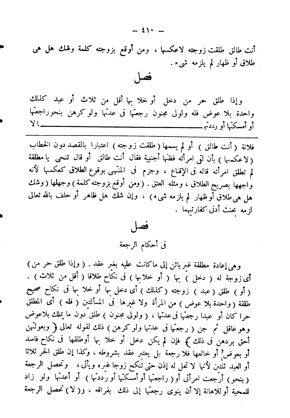 وهي إعادة مطلقة غير بائن إلى ما كانت عليه بغير عقد. (وإذا طلق حر من) أي زوجة له (دخل) بها (أو خلا بها) في نكاح طلاقا (أقل من ثلاث)، (أو) طلق (عبد) زوجته (كذلك) أي دخل بها أو خلا بها في نكاح صحيح طلقة (واحدة بلا عوض) من المرأة ولا غيرها في المسألتين (فله) أي المطلق حرا كان أو عبدا رجعتها في عدتها، (ولولى مجنون) طلق دون ما يملك بلا عوض وهو عاقل ثم جن (رجعتها في عدتها ولو كرهن) ذلك لقوله تعالى (وبعولتهن أحق بردهن في ذلك) فإن لم يكن دخل أو خلا بها أو طلقها في نكاح فاسد أو بعوض أو خالعها فلا رجعة بل يعتبر عقد بشروطه، وكذا إن طلق الحر ثلاثا أو العبد ثنتين لأنها لا تحل له إذن حتى ننكح زوجا غيره ويأتي، وتحصل الرجعة (بنحو) أرجعت امرأتي أو (راجعتها أو أمسكتها أو رددتها) أو أعدتها ولو زاد للمحبة أو للإهانة إلا أن ينوى رجعتها إلى ذلك بفراقه، و (لا) تحصل الرجعة