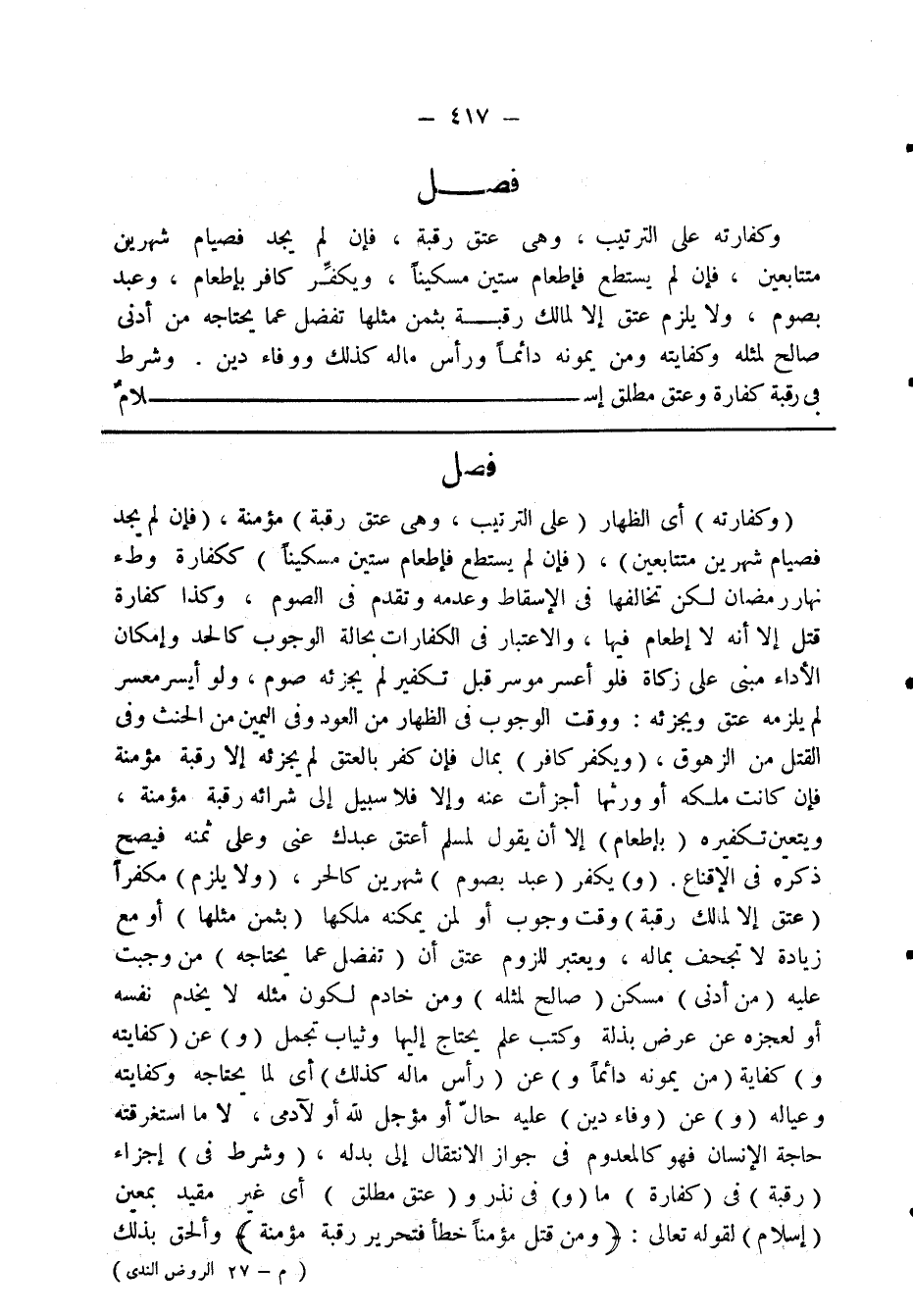 فصل وكفارته على الترتيب، وهي عتق رقبة، فإن لم يجد فصيام شهرين متتابعين، فإن لم يستطع فإطعام ستين مسكينا. ويكفِّر كافر بإطعام، وعبد بصوم، ولا يلزم عتق إلا لمالك رقبة بثمن مثلها تفضل عما يحتاجه من أدنى صالح لمثله وكفايته ومن يمونه دائمًا ورأس ماله كذلك ووفاء دَين. وشرط في رقبة كفارة وعتق مطلق إسلام