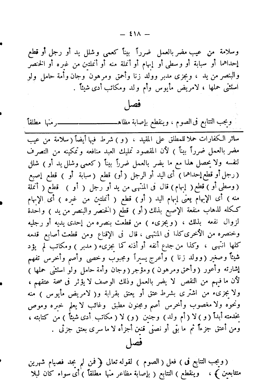وسلامة من عيب مضر بالعمل ضررًا بينًا كعمى وشلل يد أو رجل أو قطع إحداهما أو سبابة أو وسطى أو إبهام أو أنملة منه أو أنملتين من غيره أو الخنصر والبنصر من يد، ويجزى مدبر وولد زنا وأحمق ومرهون وجان وأمة حامل ولو استثنى حملها، لا مريض مأيوس وأم ولد ومكاتب أدى شيئًا