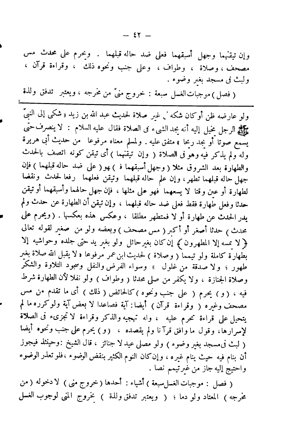 ولو عارضه ظن أو كان شكه في غير صلاة لحديث عبد الله بن زيد «شكى إلى النبي صلى الله عليه وسلم الرجل يخيل إليه أنه يجد الشيء في الصلاة فقال عليه السلام: لا ينصرف حتى يسمع صوتًا أو يجد ريحًا» متفق عليه، ولمسلم معناه مرفوعًا من حديث أبي هريرة ولم يذكر فيه وهو في الصلاة (وإن تيقنهما) أي تيقن كونه اتصف بالحدث والطهارة بعد الشروق مثلاً (وجهل أسبقهما) فهو (على ضد حاله قبلهما) فإن جهل حاله قبلهما تطهر، وإن علم حاله قبلهما وتيقن فعلهما رفعًا لحدث ونقضًا لطهارة أو عين وقتًا لا يسعهما فهو على مثلها، فإن جهل حالهما وأسبقهما أو تيقن حدثًا وفعل طهارة فقط فعلى ضد حالة قبلهما، وإن تيقن أن الطهارة عن حدث ولم يدر الحدث عن طهارة أو لا فمتطهر مطلقًا، وعكس هذه بعكسها. (ويحرم على محدث) حدثًا أصغر أو أكبر (مس مصحف) وبعضه ولو من صغير لقوله تعالى: {لّا يَمَسُّهُ إِلاَّ الْمُطَهَّرُونَ} [الواقعة: 79]، إن كان بغير حائل، ولو بغير يد حتى جلده وحواشيه إلا بطهارة كاملة ولو تيممًا (وصلاة) لحديث ابن عمر مرفوعًا: «لا يقبل الله صلاة بغير طهور، ولا صدقة من غلول» وسواء الفرض والنفل وسجود التلاوة والشكر وصلاة الجنازة، ولا يكفر من صلى محدثًا (وطواف) ولو نفلاً؛ لأن الطهارة شرط فيه، (و) يحرم (على جنب ونحوه) كالحائض (ذلك) أي ما تقدم من مس مصحف وغيره (وقراءة قرآن) أيضًا آية فصاعدًا لا بعض آية ولو كرره ما لم يتحيل على قراءة تحرم عليه، وله تهيجه والذكر وقراءة لا تجزئ في الصلاة لإسرارها، وقول ما وافق قرآنًا ولم يقصده، (و) يحرم على جنب ونحوه أيضًا (لبث في مسجد بغير وضوء) ولو مصلى عيد لا جنائز، قال الشيح: وحينئذ فيجوز أن ينام فيه حيث ينام غيره، وإن كان النوم الكثير ينقض الوضوء، فلو تعذر الوضوء واحتيج إليه جاز من غير تيمم نصًا.